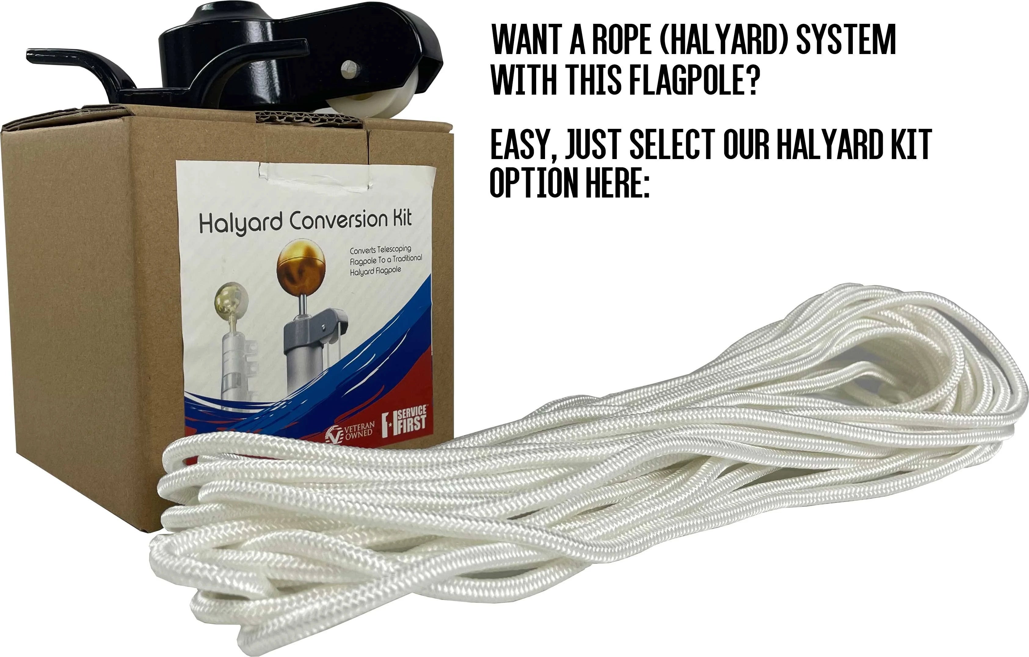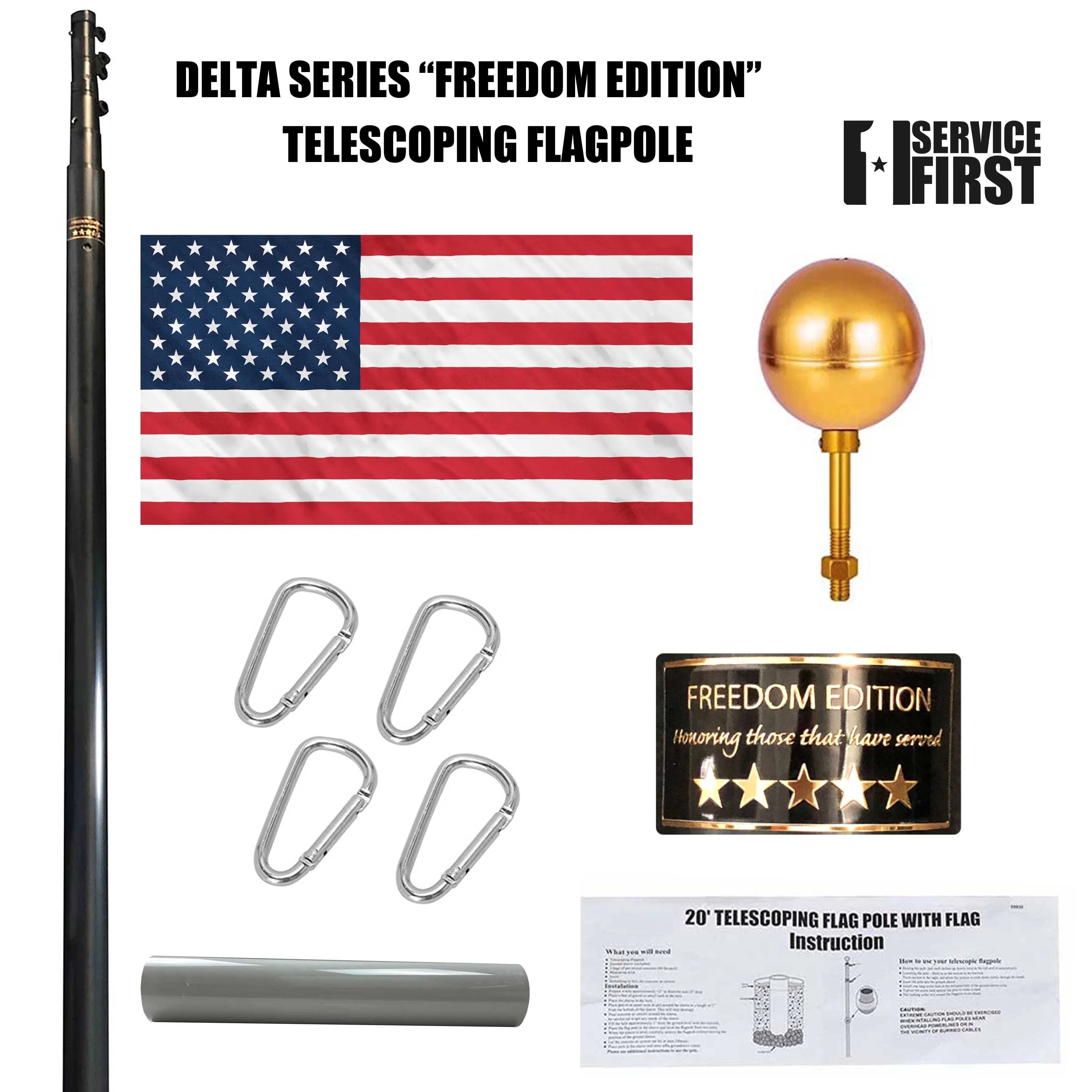 MAKE IT EASY AND SAVE!!! GET THE BUNDLE What do I get 20' or 25' Freedom 11 Gauge Telescoping Flagpole Li-Ion Solar Power Flagpole Light by Service First 14" Matching Flash Collar to finish off your flagpole. Easy, Do-it-yourself, Service First Flagpole kits. Set up in minutes! (DIY setup takes approximately 35-45 minutes!) FEATURING OUR SERVICE FIRST 11 GAUGE WIND RESISTER DESIGN! This is the Delta Pin-Lock Telescoping Flag Pole FREEDOM EDITION BLACK. This limited edition Freedom Edition is has an anodized Black finish and a Freedom Edition plaque located on the flag pole. The Freedom Edition Plaque reads "Honoring those that have served" This is the Delta Pin-Lock Telescoping Flagpole. All Kits come with everything you need including: - Freedom Edition Black Anodized - "Honoring Those that have Served" Plaque - 10 year no fade Electrolytic plated black coating - No Rust (anodized type II) Pin-Lock Telescoping flag pole (11 gauge aluminum!) - Telescoping poles feature 360 degree swivel clips - Compare our 11 Gauge poles to our competitors thinner 16 Gauge - 18" PVC Sleeve for easy mounting and set up. - Gold Ball Finial - 20' or 25' sizes available - Pin-lock secure locking system. Not a twist lock that fails - All necessary hardware to fly 2 flags - 2 7/8" Diameter (73mm OD) - Instructional packet. - Tested at 100 MPH winds - FREE 3 x 5 Printed Polyester American Flag - Set up is complete in minutes! Ever wanted a flagpole in your yard, but didn't want to go through the trouble? This kit is perfect for you! INCLUDED ACCESSORIES: Flash collar, Solar light Solar Light The Service First Solar Light is different then most. It is engineered to be brighter, last longer and have an extended battery life. The perfect solution to keeping your flag lit. Solar Power Panels Recharge Your Light During the Day, and High Power LEDs Illuminate Your Flags at Night! Light Specs: 48 Outdoor Rated LED Lights 3V/2200mAh Lithium-ion Battery 3V/100mAh Solar Panel Charging Fits 1/2 finial stem, no tools required Photo sensor enabled. Light up automatically at night 10-12 hour light time Flash Collar Finish off your Flag pole with the perfect accessory. This Flash collar will give your flag pole the perfect finishing touch! Built from high strength aluminum. This Delta pole has been tested at 100+ MPH winds. More information can me found on this product in our accessory section. FEATURING OUR PROPRIETARY TELESCOPING HIGH-WIND DESIGN! OPTIONAL HALYARD KIT: Looking to have the traditional rope system on your telescoping pole? Just add the optional Halyard kit to your Flagpole Bundle. Additional $39.98 Link to the halyard kit: Halyard Kit **What is a Halyard kit? The Halyard kit replaces the 360 degree swivel clips on the pole with a traditional Rope System. So instead of lowering the telescoping pole to remove the flags you would have the flags clipped to the rope and lower that. Flying a Flag at Half Staff on a Telescoping Flagpole: Learn More about the Freedom Edition Telescoping Flagpole Installation Video: