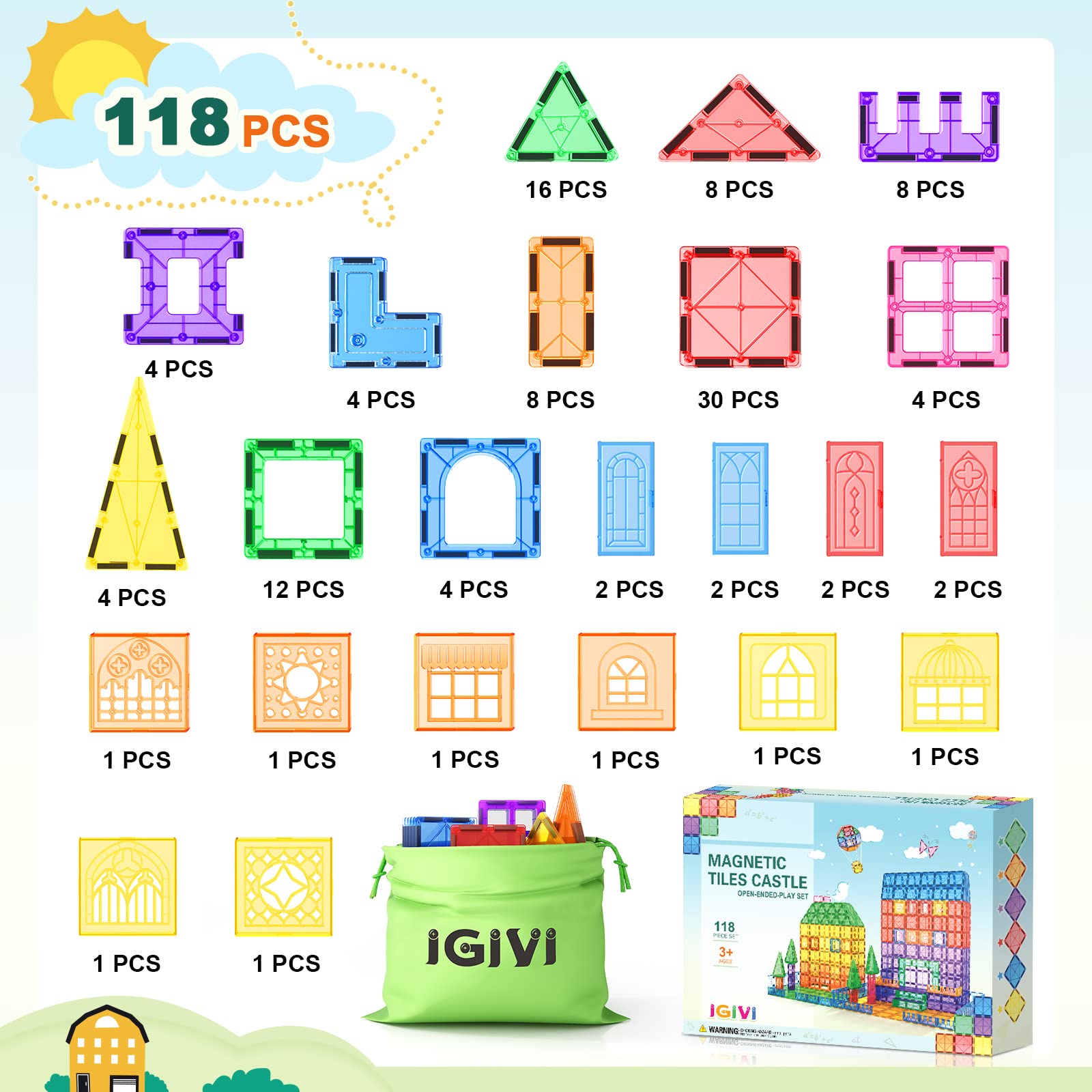 - u3010Abundant Magnetic Tiles Setu3011 The set includes 118 magnetic tiles and window blocks, providing kids with plenty of accessories to unleash theiru00a0boundless creativityu00a0and stimulate their imagination. With moreu00a0magnetic tiles, kids can build more interestingu00a0magnetic games, making their playtime more exciting and enjoyable.
