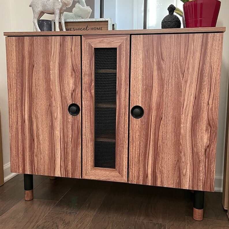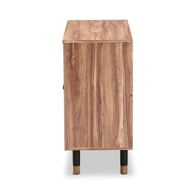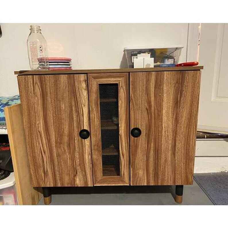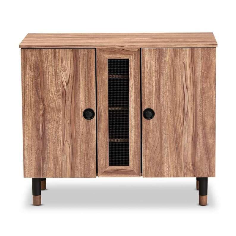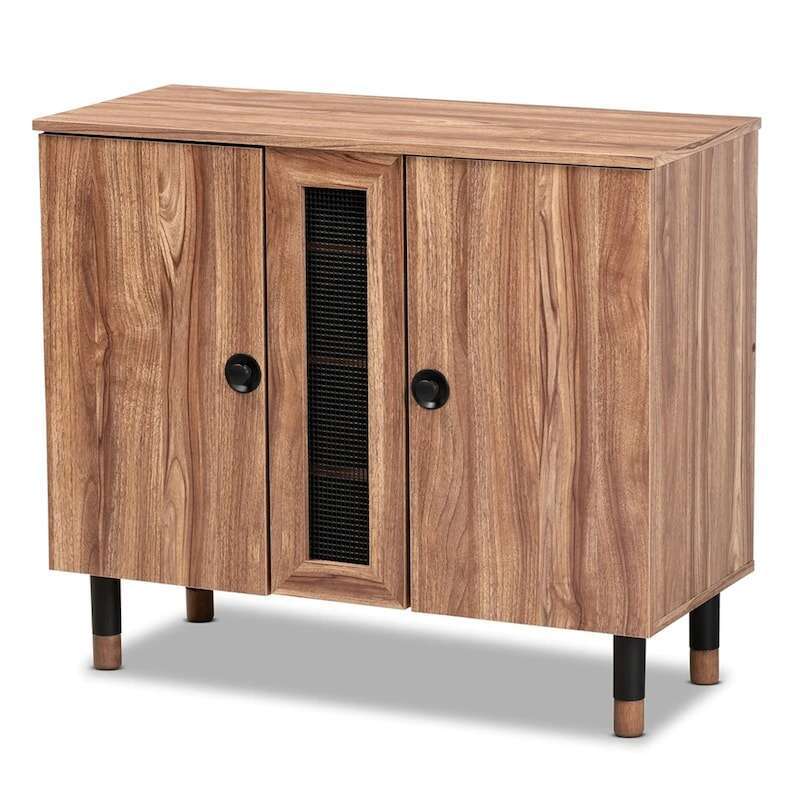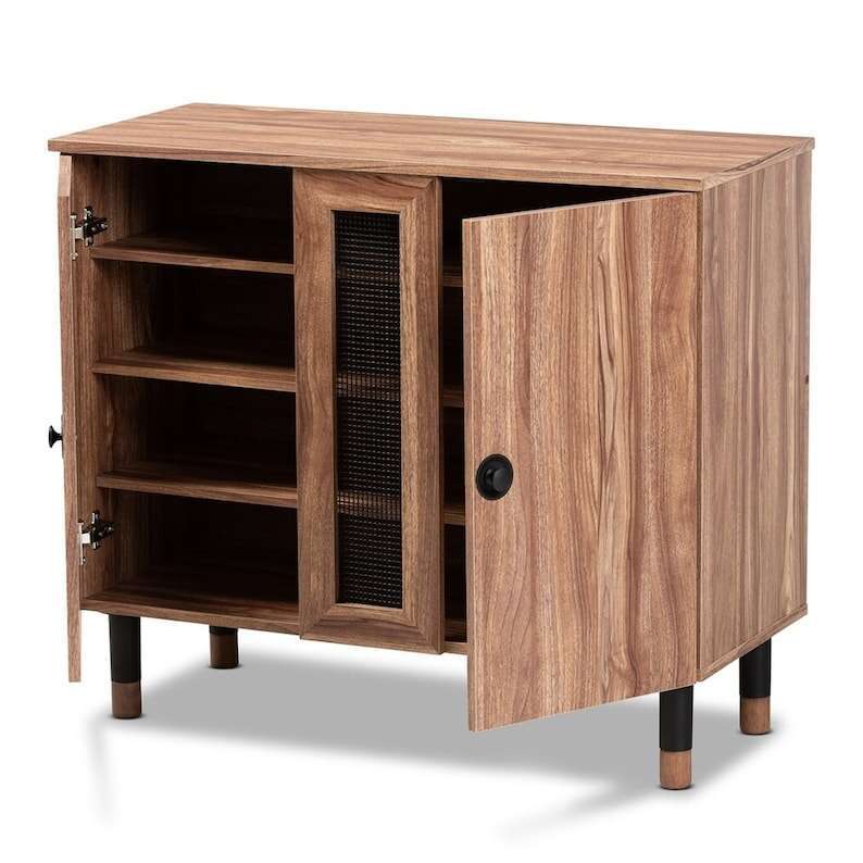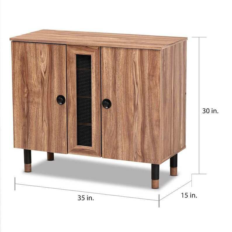 With this modern shoe storage cabinet, you can eliminate clutter in your foyer or mudroom. This chest blends elegance and practicality for a designer appeal, with a natural oak finish and crisp, clean design. The spacious two-door design conceals four shelves to provide plenty of space for your family and friends' shoes, and the middle screen gives plenty of ventilation.