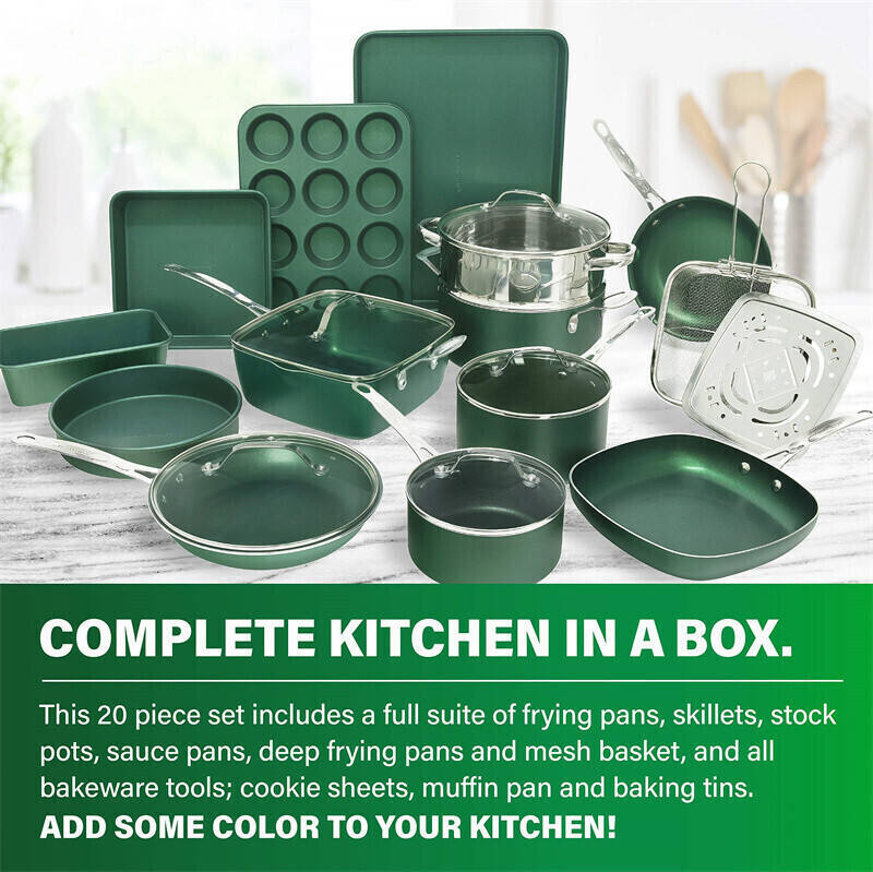 - COMPLETE KITCHEN IN ONE BOX - includes everything you need to fully outfit your kitchen and take cooking and baking to the next level, including a complete cookware set with frying pans, skillets, saucepans, soup pots with tempered glass lids, a frying and casserole pan with steamer insert, frying basket and lid, and a complete PRO baking kit with cookie sheet/jelly roll pan, loaf pan, muffin tin, square pan and more!
