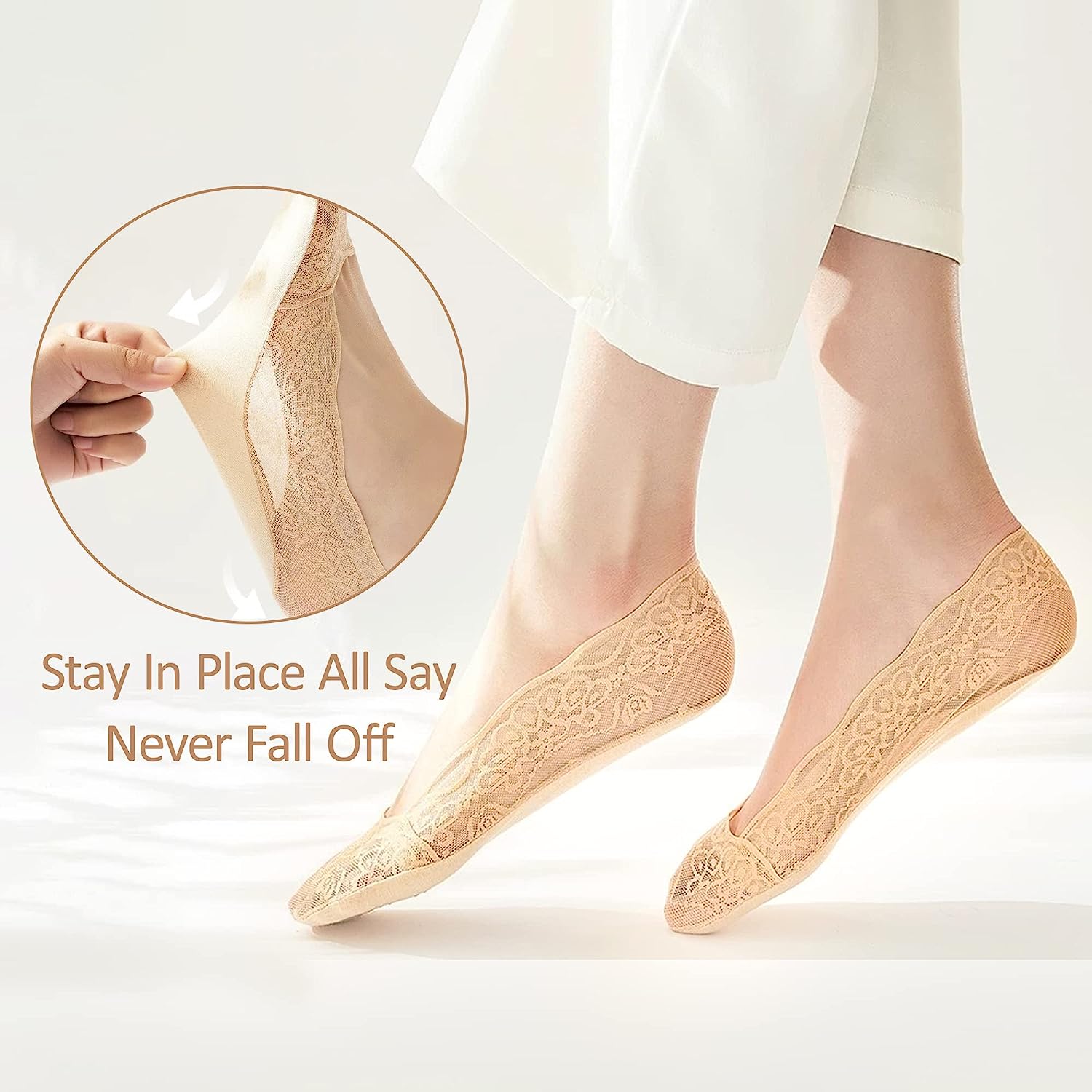 👠 Non Slip --- The non slip silicone around the top edge keeps the lace no show socks from slipping off your foot