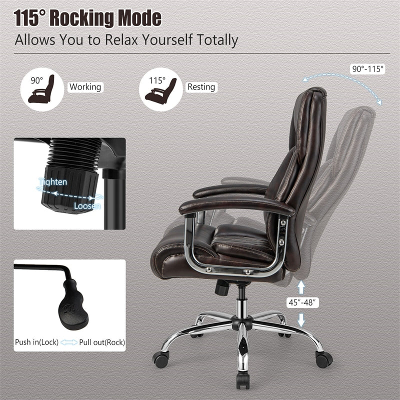 - Ergonomic Height Adjustable Design: High backrest with an integrated headrest supplies comfortable spine alignment and enables you to relax the neck muscle. Another key point to say, the rocking backrest can be tilted from 90° to 115° to help relieve fatigue after a long day's work. And you can adjust the leather executive chair's height from 45''- 48'' easily.