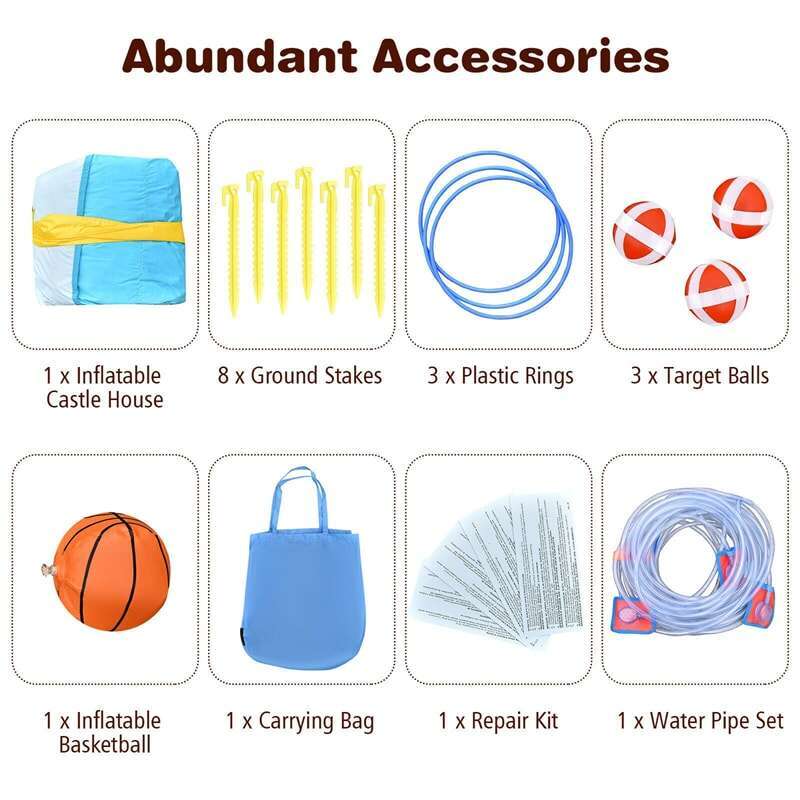This 7-in-1 inflatable water slide park bounce house with bright colors and fun games will be the talk of all the kids! This attractive inflatable bouncy castle is designed with a bounce area, a basketball hoop, a water gun, and two slides, all of which allow children to build friendships with friends. Plus, 3 plastic rings, 3 target balls, and an inflatable basketball will bring more enjoyment to your lovely kids. Made of 420D and 800D Oxford cloth, this inflatable water slide is puncture-resistant and long-lasting. Combining the advantages of maximum ventilation and reliable protection, the mesh netting wall brings your children a comfortable and safe entertainment environment. And the unique outlet tube design can help the basketball to deflate within a few minutes. In addition, the portable carrying bag ensures you quickly store all accessories to prevent loss.