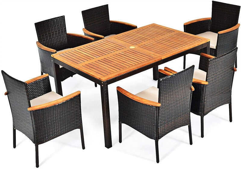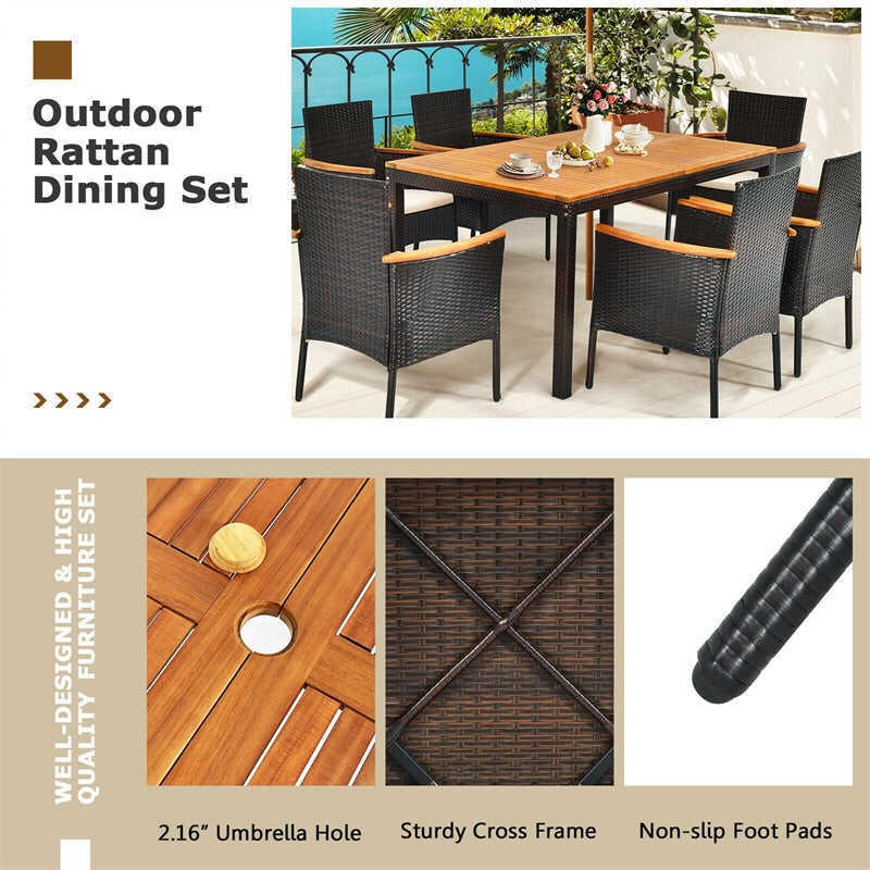 • 7 Piece Rattan Patio Dining Set with Acacia Wood Table & Stackable Wicker Chairs