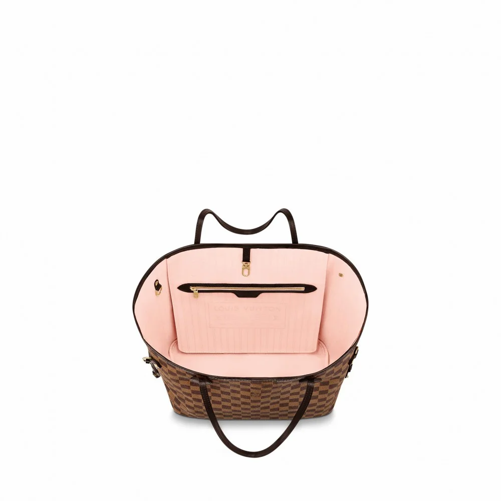 Legendary Neverfull: always exactly what you need it to be. Capacious but not bulky. structured yet supple. at home in the town or in the country. Cinch the side laces. and voila! it\'s a sleek city bag. Loosen them and you have a chic. practical tote. The slim leather handles fit over the shoulder or on the arm. Shown here in Damier Ebene's canvas.DETAILED FEATURES12.6 x 11.22 x 6.69 inches(length x height x width)•12.5 x 11.5 x 6.5 inches•Redesigned interior with L archive details&bullTextile-lined inside pocket•Removable zippered clutch with matching interior•Natural cowhide leather trim•Golden color metallic pieces- Brand: L- Type: Totes- Color: PinkWe offer multiple choices of shipping destinations and shipping fees.We allow returns for a full refund and free exchange within 30 days.For complete details. please read our Shipping Policy and Return & Exchange Policy.