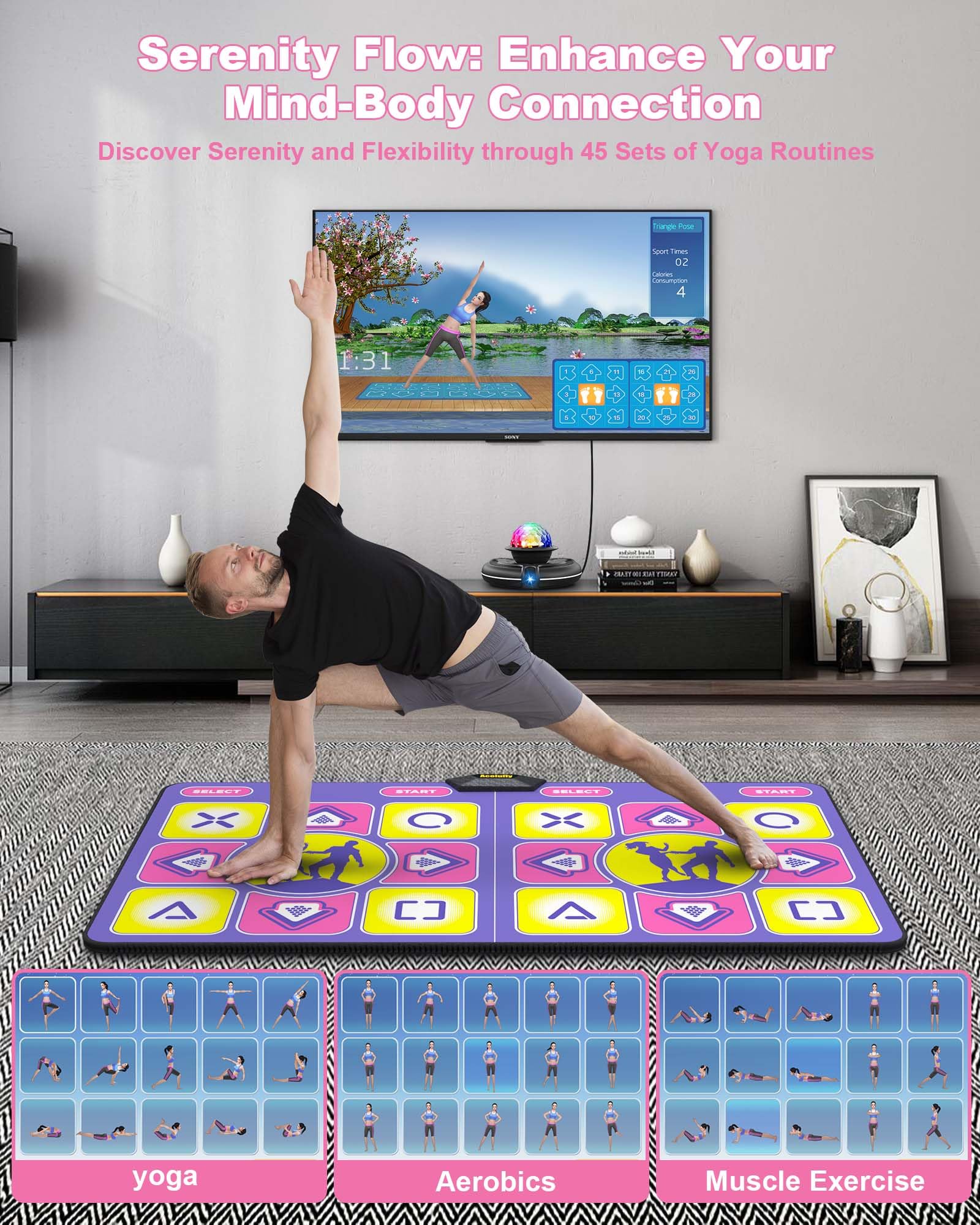 - ud83dudc83u3010ENERGIZE YOUR ENTERTAINMENTu3011 Acelufly interactive dance mat - where fun meets fitness! With 3 dance modes, 150+ songs, 6 immersive camera games, 45 yoga guides, 3 thrilling running games & a collection of 70+ wireless controller games, it's the ultimate entertainment package for everyone.