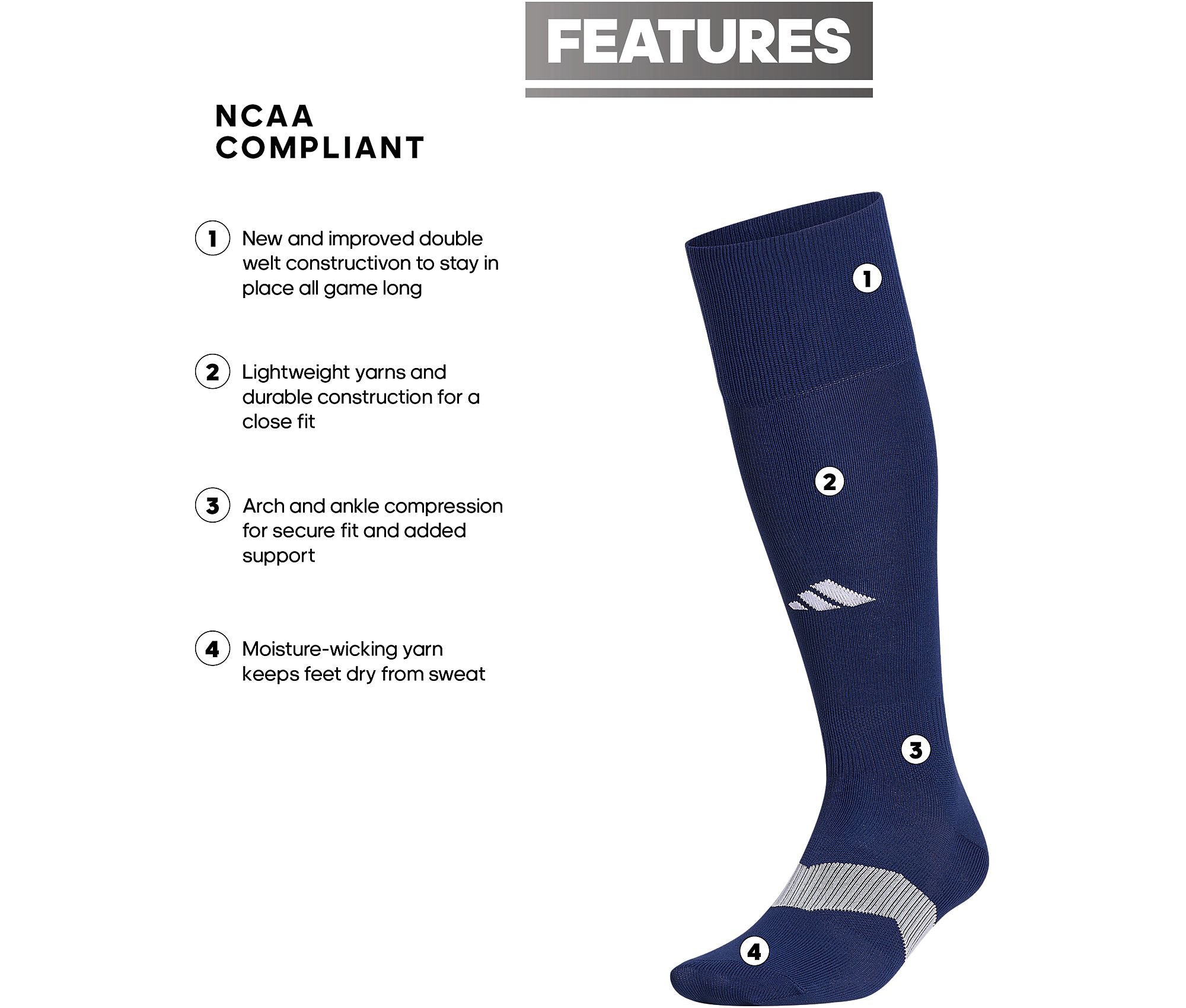 Experience ultimate comfort and performance with adidas socks, featuring double-welt construction for all-day stay-in-place assurance. Crafted from moisture-wicking yarn and compliant with NCAA standards, these over-the-calf socks provide arch and ankle compression, ensuring a secure and supportive fit throughout the game.