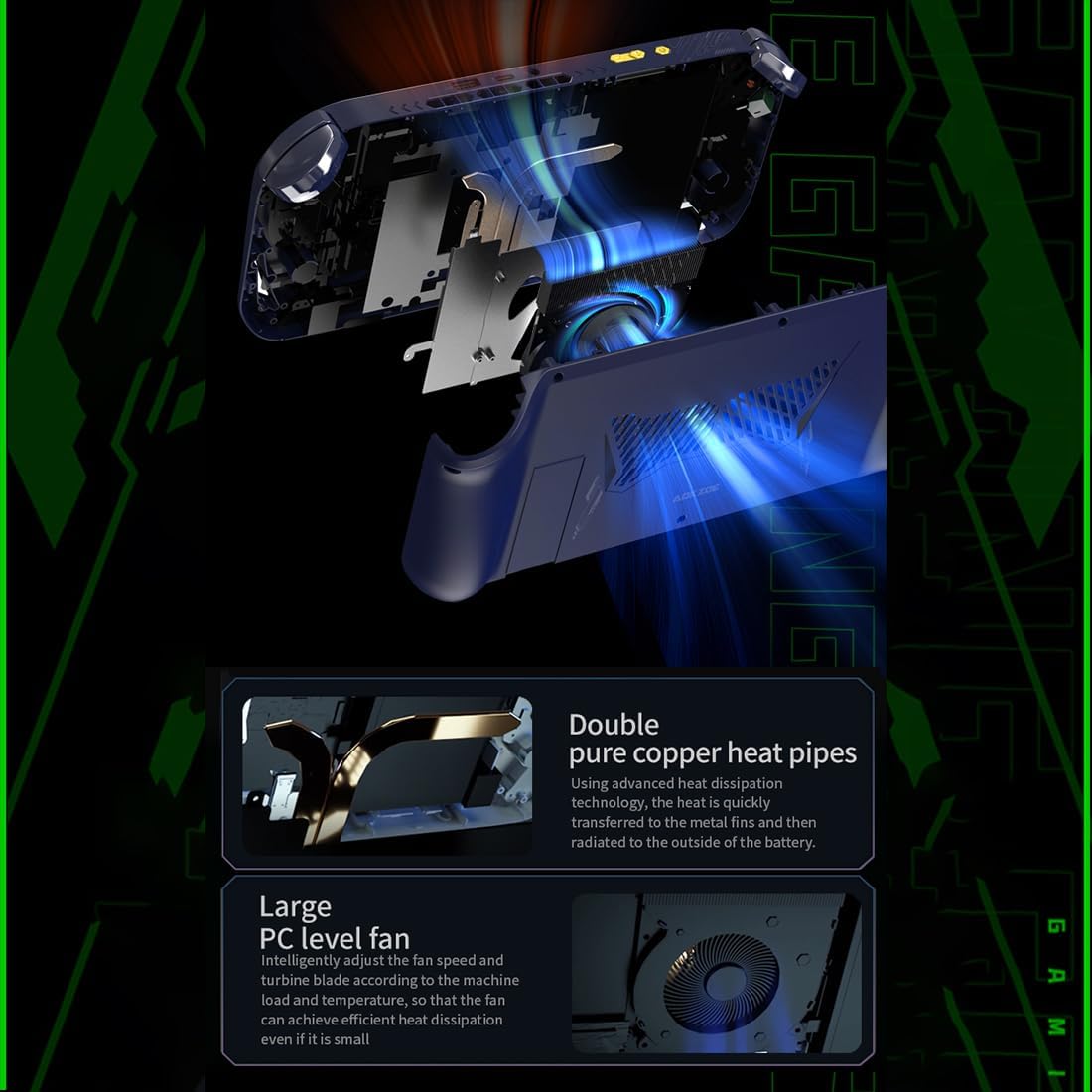 .Cooling: fan*1, pure aluminum heat sink*1, pure copper heat pipes*2, intelligent temperature control system