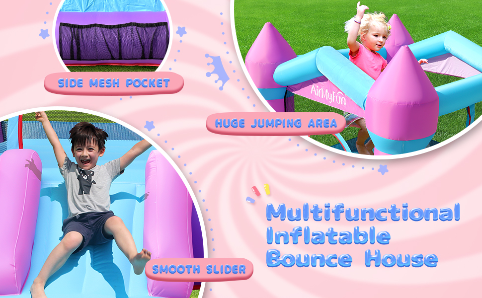 - [Intimate Design]: There is a slide and a huge jumping area in the inflatable bouncy house, which is suitable for 2~3 children to play. Itu2019s enough ensure that the jumping playhouse will not roll over easily. There are mesh pockets on the sides. When you take off your shoes or donu2019t need any toys temporarily, you can put them in the mesh pocket.