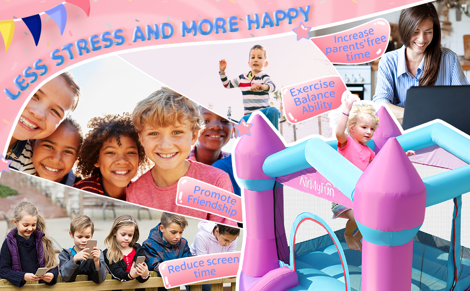 - [Great Creative Gift]: AirMyFun Bounce Jumper Castle is suitable for 2~3 children in the yard or garden or indoor to share happy time together during the holiday, which is beneficial to increase the opportunities for children to exercise, reduce the time spent on mobile phones, and reduce the burden on parents.