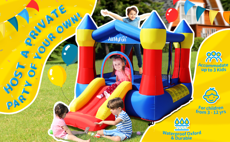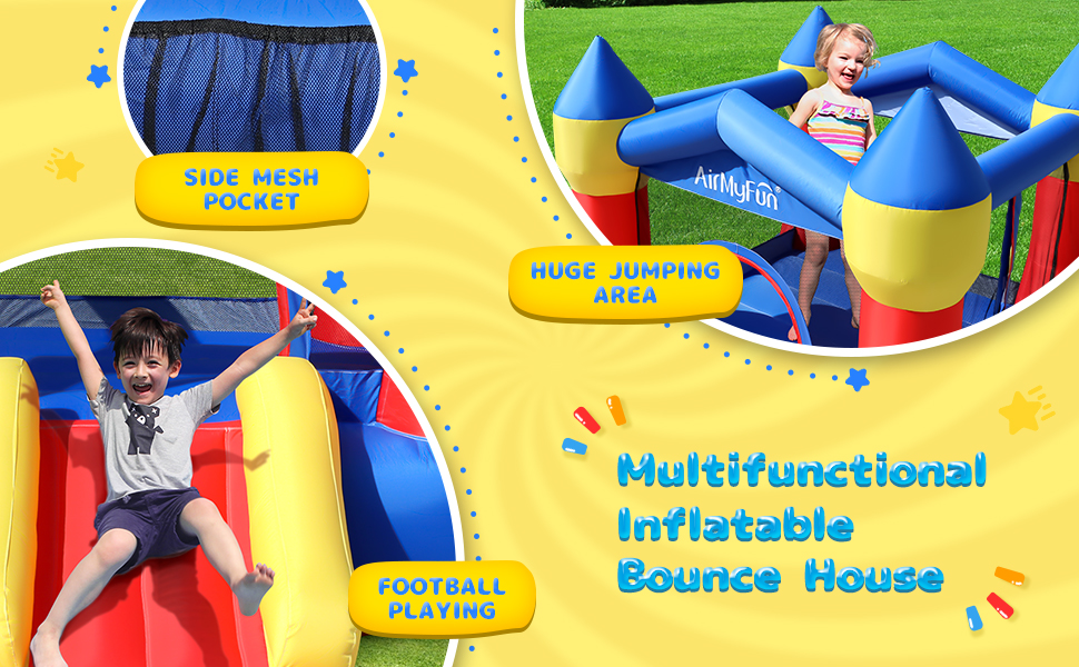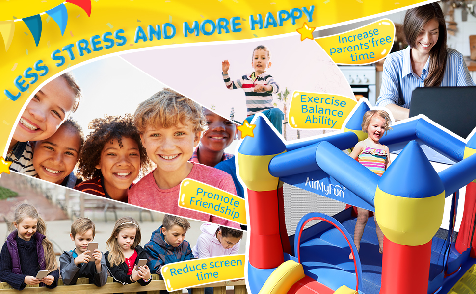 - Great Creative Gift: AirMyFun Bounce Jumper Castle is suitable for 2~3 children in the yard or garden or indoor to share happy time together during the holiday, which is beneficial to increase the opportunities for children to exercise, reduce the time spent on mobile phones, and reduce the burden on parents.