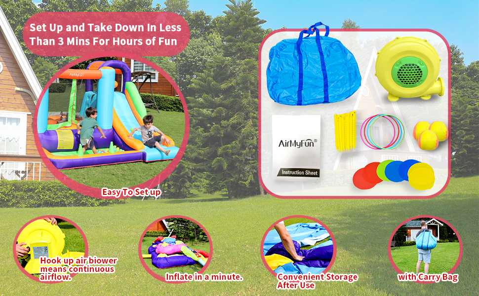 - Perfect accessory kit: Each item is equipped with a 450W air blower, carry bag, some repair patches and lawn stakes. All accessories are prepared for you, saving time to go to store.
