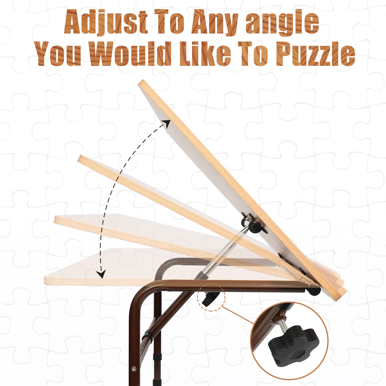 - u3010Adjustable Angle and Heightu3011Our puzzle boards portable top part can be adjusted to any angle within the range of 0-90 degrees.puzzle table with legs have 6 adjustable heights, between 26.3u2019u2019to 35u2019u2019, press the buttons,allow you to adjust depend on your comfort and height.Great flexibility.