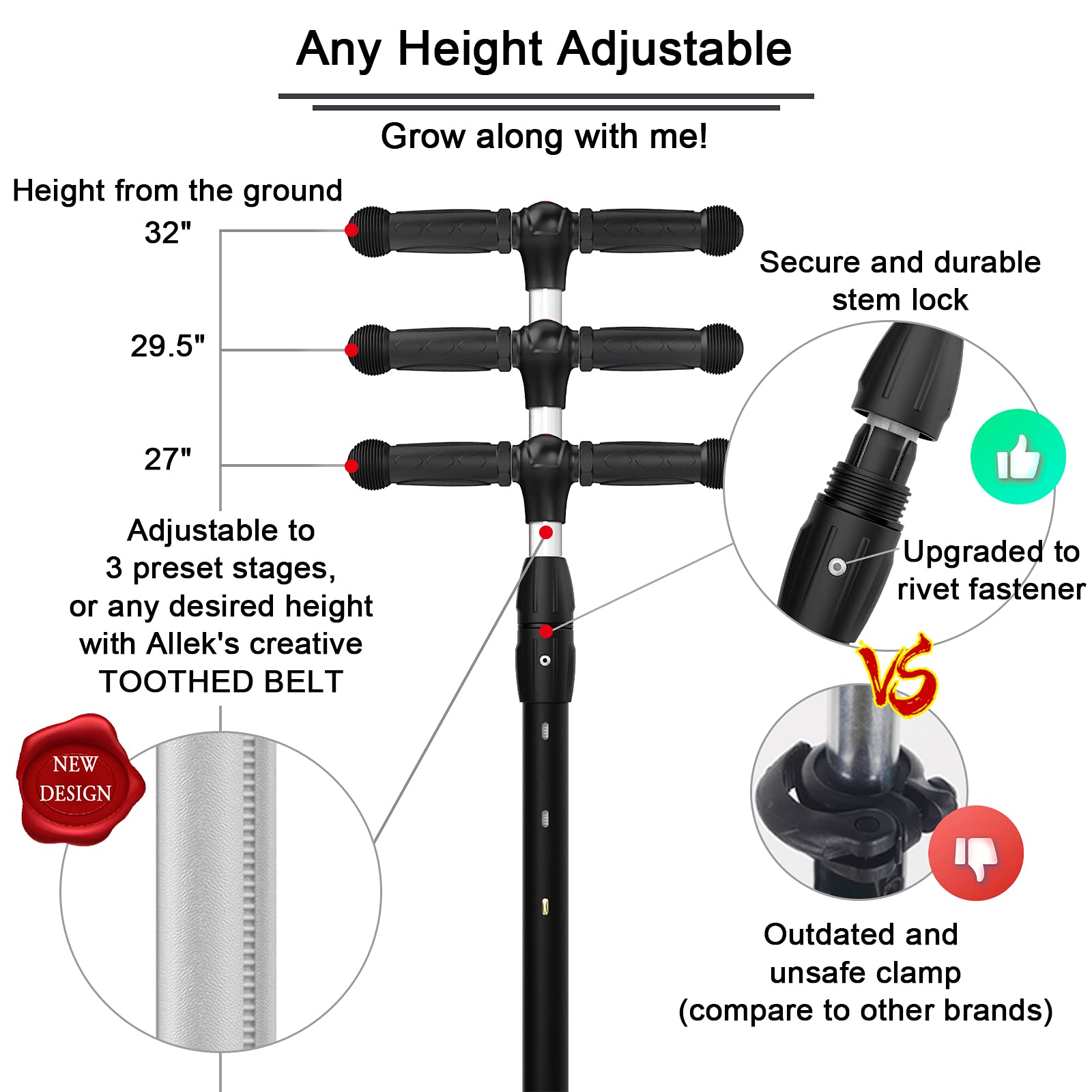 - ANY HEIGHT ADJUSTABLE u2013 Aluminum scratch resistant T-bar comes with 3 preset stages, and furthermore, thanks to Alleku2019s creative toothed belt, the handlebar can also be adjusted to any heights between 25.5" to 32". Easily find your perfect riding position.