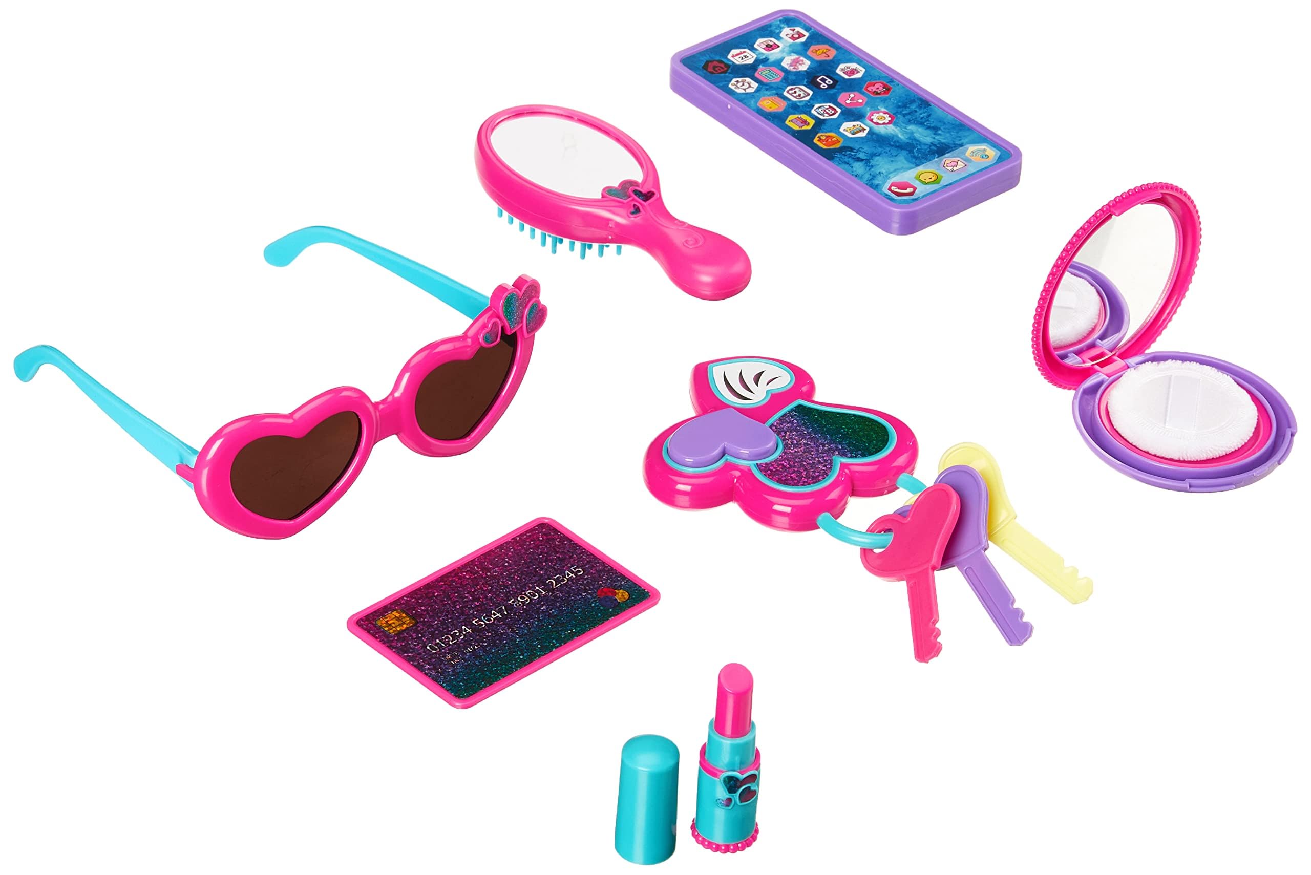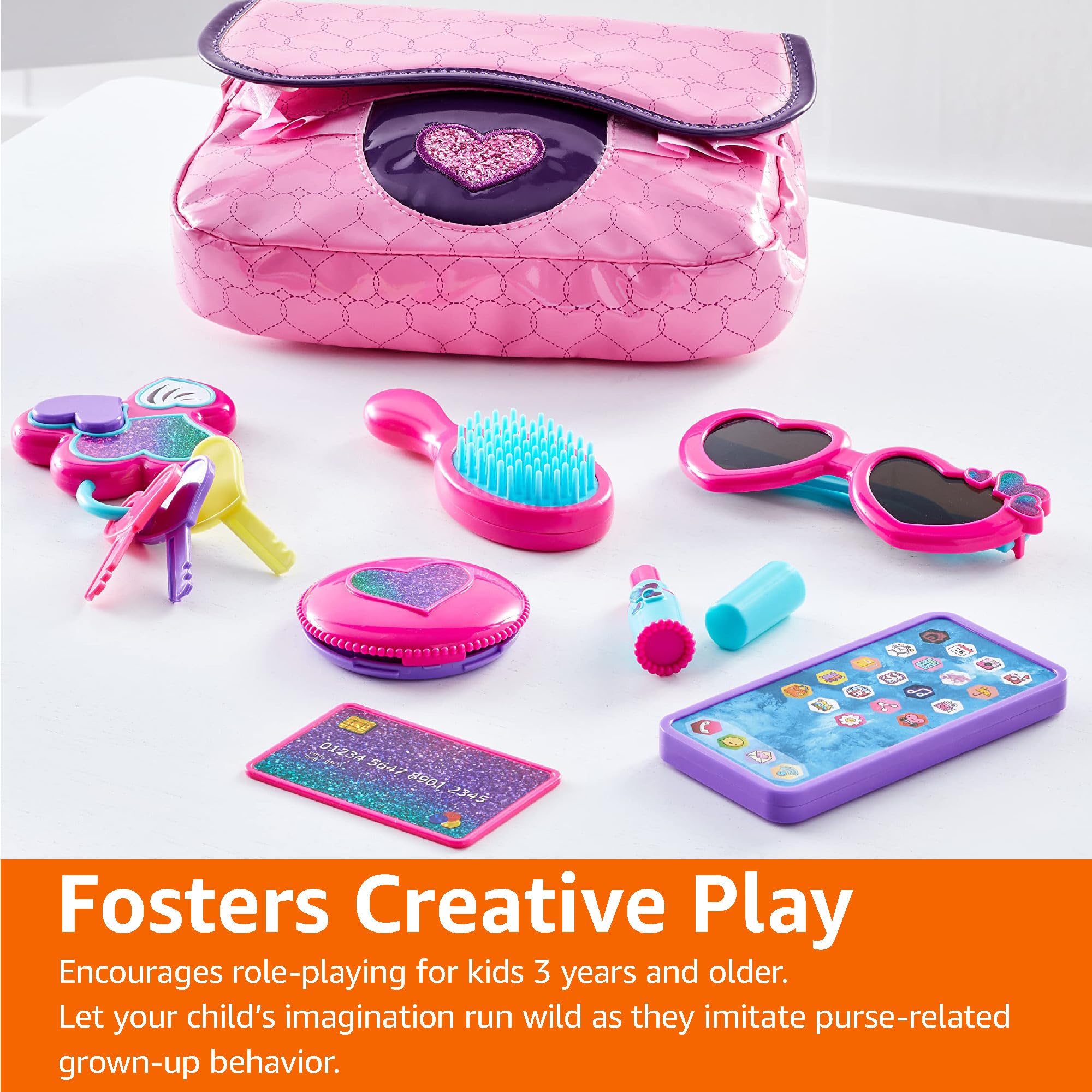 - 8-PIECE PRETEND PLAY PURSE SET: Our Children's Toy Purse and Pretend Play Set is designed to inspire creative play, which includes a pretend handbag, sunglasses, a smartphone, a makeup compact with powder puff, a credit card, a hair brush, a lipstick with cap, and a keychain with keys