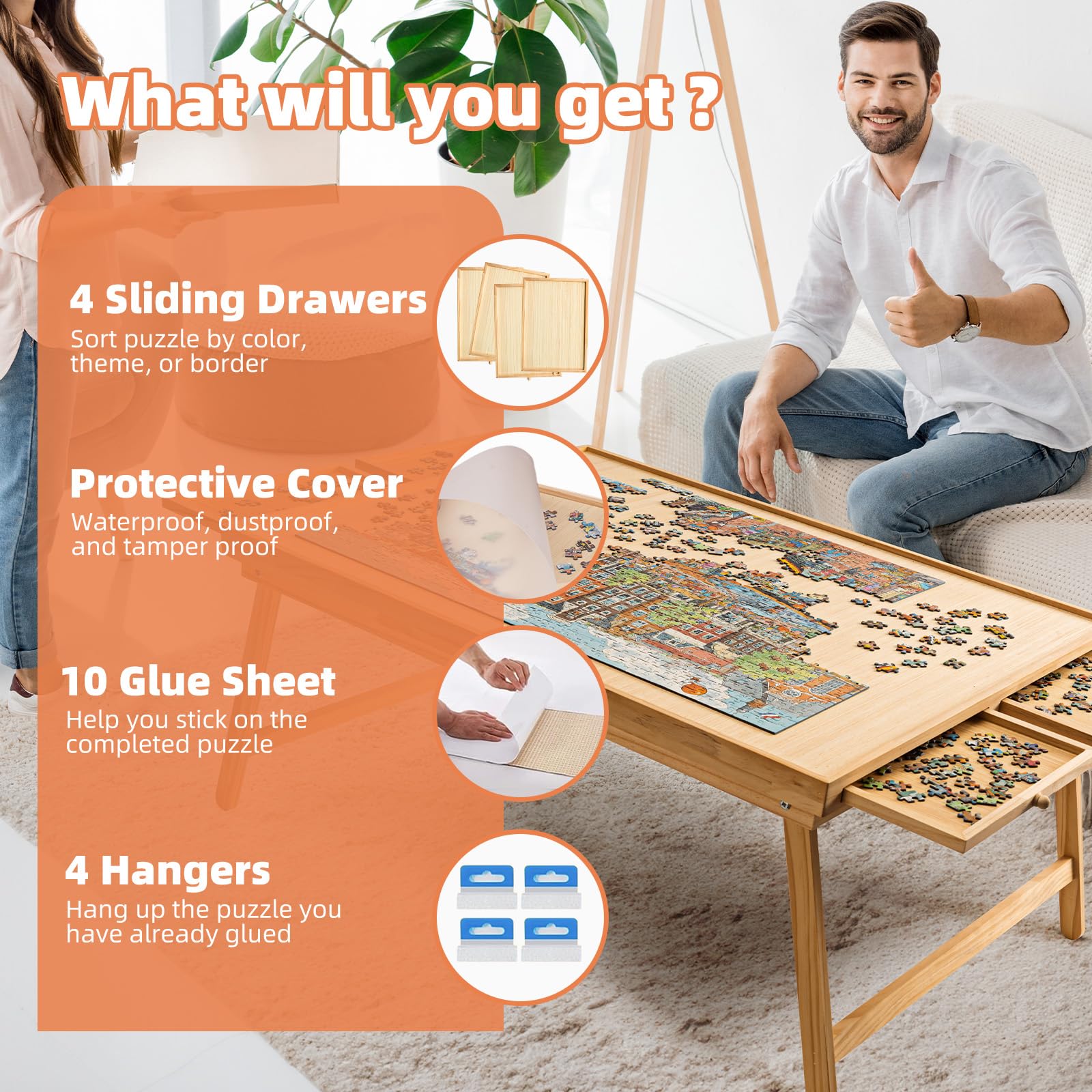 - u30104 Drawers&1 Protective Coveru30114 Sliding drawers provide additional puzzle storage space, will not occupy desktop space and allowing for classification based on the color, theme, or border of the puzzle; Translucent protective cover for unfinished puzzle, waterproof and dustproof to prevent pets from getting messy.