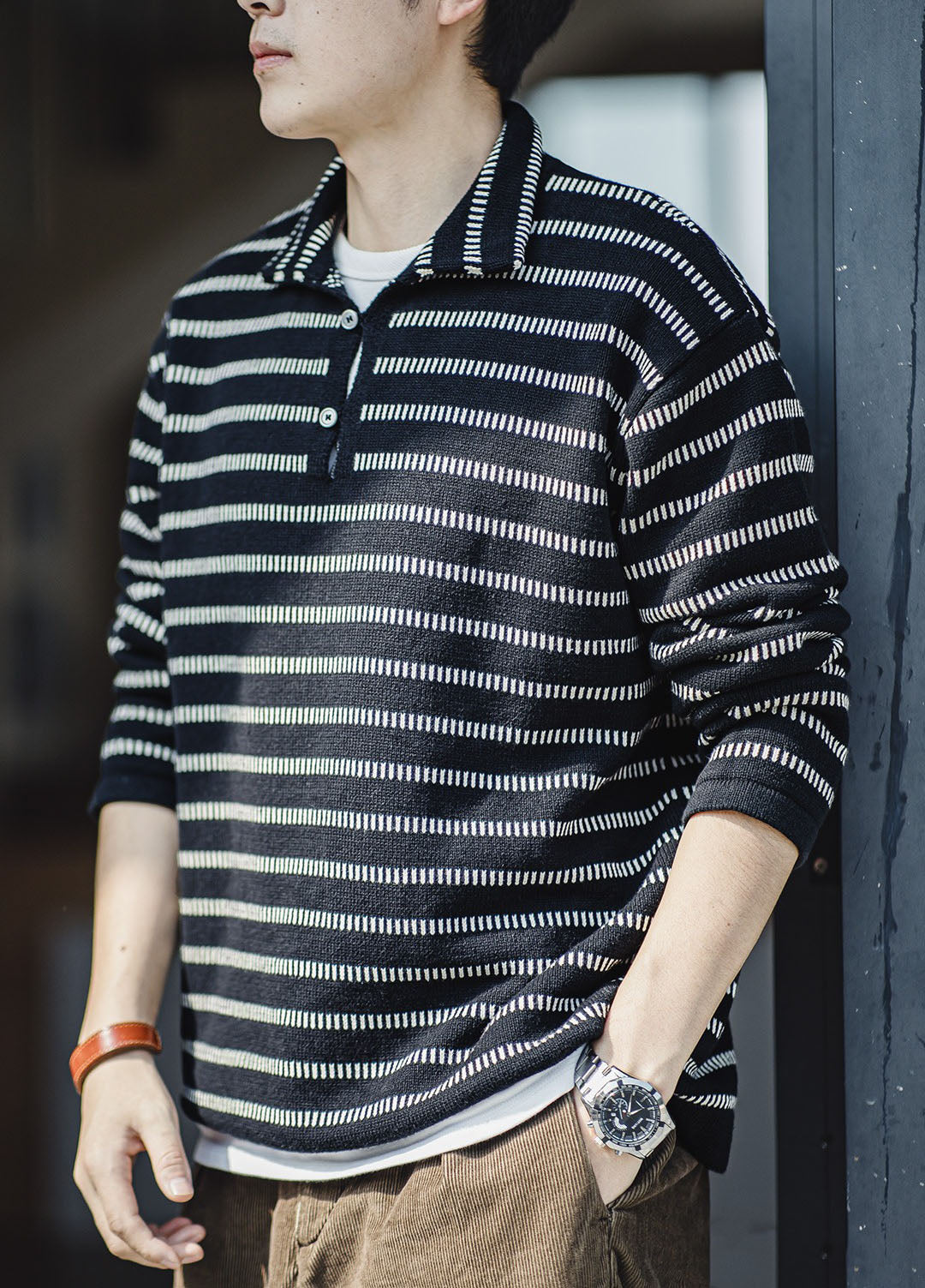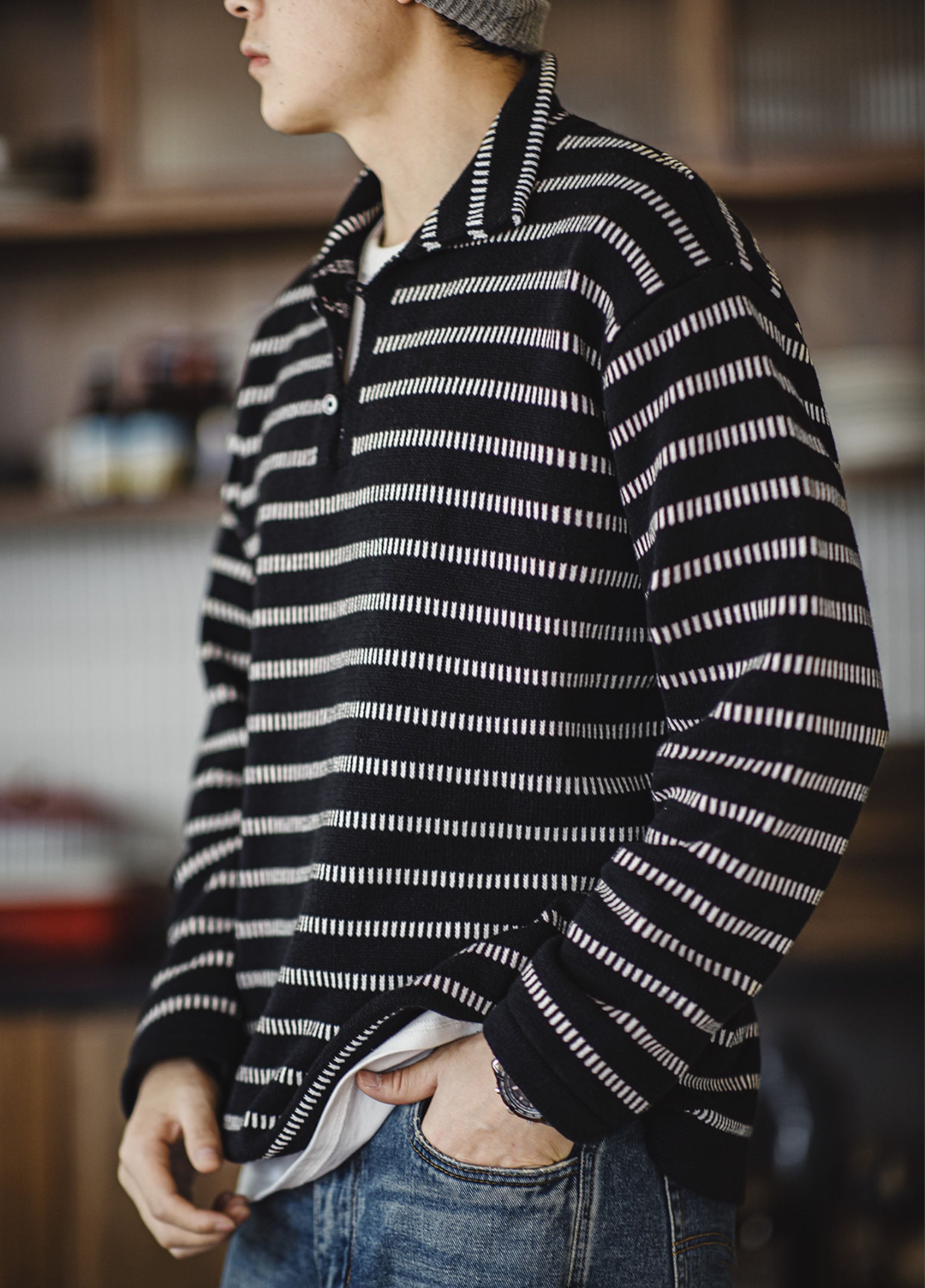 Stay cozy and stylish this season with our premium knitted sweater. The American Striped Polo Sweater is designed for the modern man who values comfort and fashion.