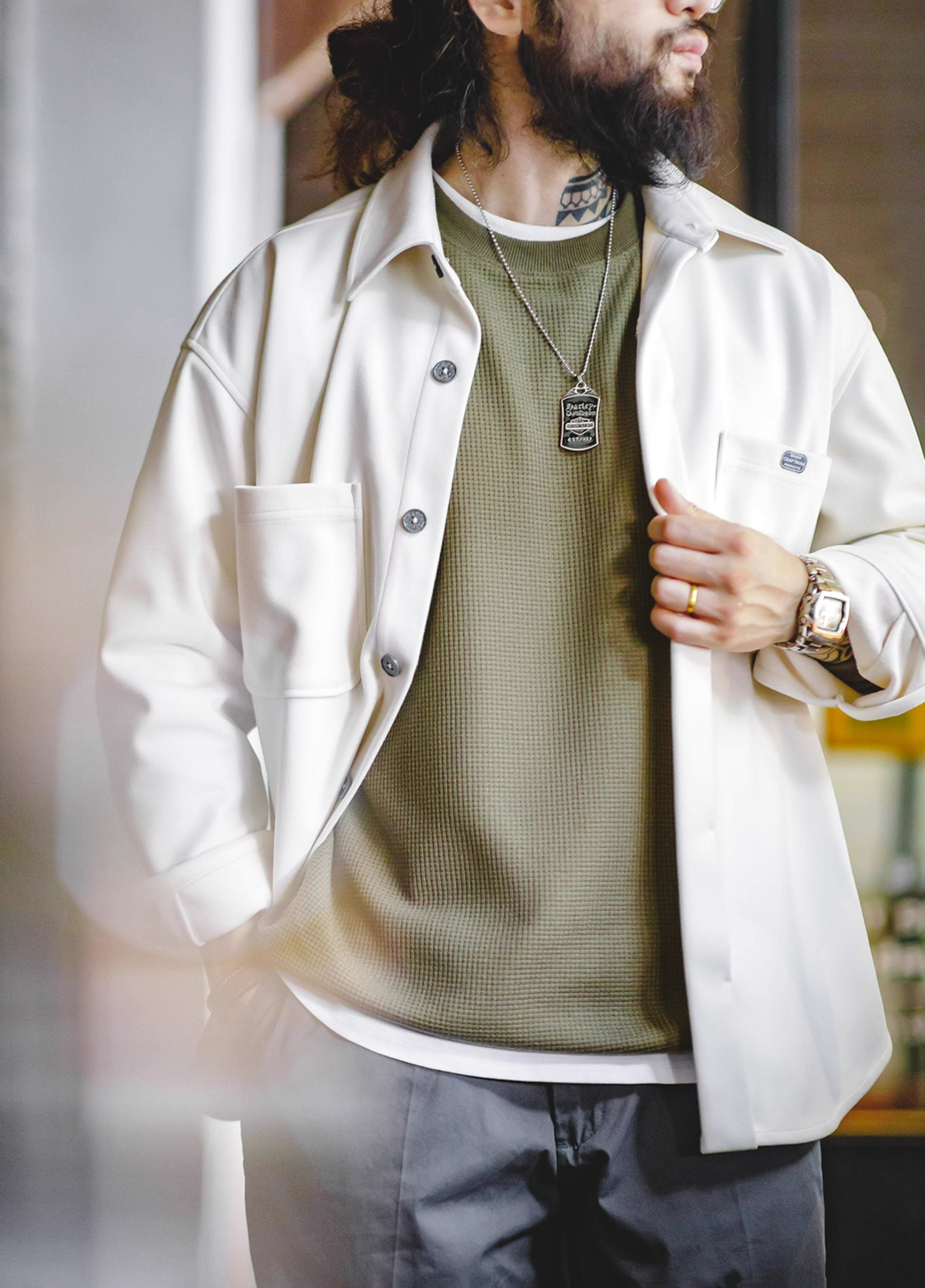 Imagine a shirt that doesn't just wear but cares, giving you that warm fuzzy feeling, literally and figuratively. This Heavy Wool Pocket Loose Outerwear is more than a shirt; it's a statement. It's about celebrating the cooler seasons with style and comfort.