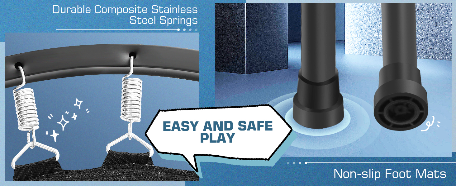 - u2705Reinforced Stitching & Non-slip Rubber Feet: Experience enhanced stability and safety during use with the trampoline's non-slip rubber feet. The reinforced stitching and utilization of high-quality materials guarantee exceptional durability and reliability.
