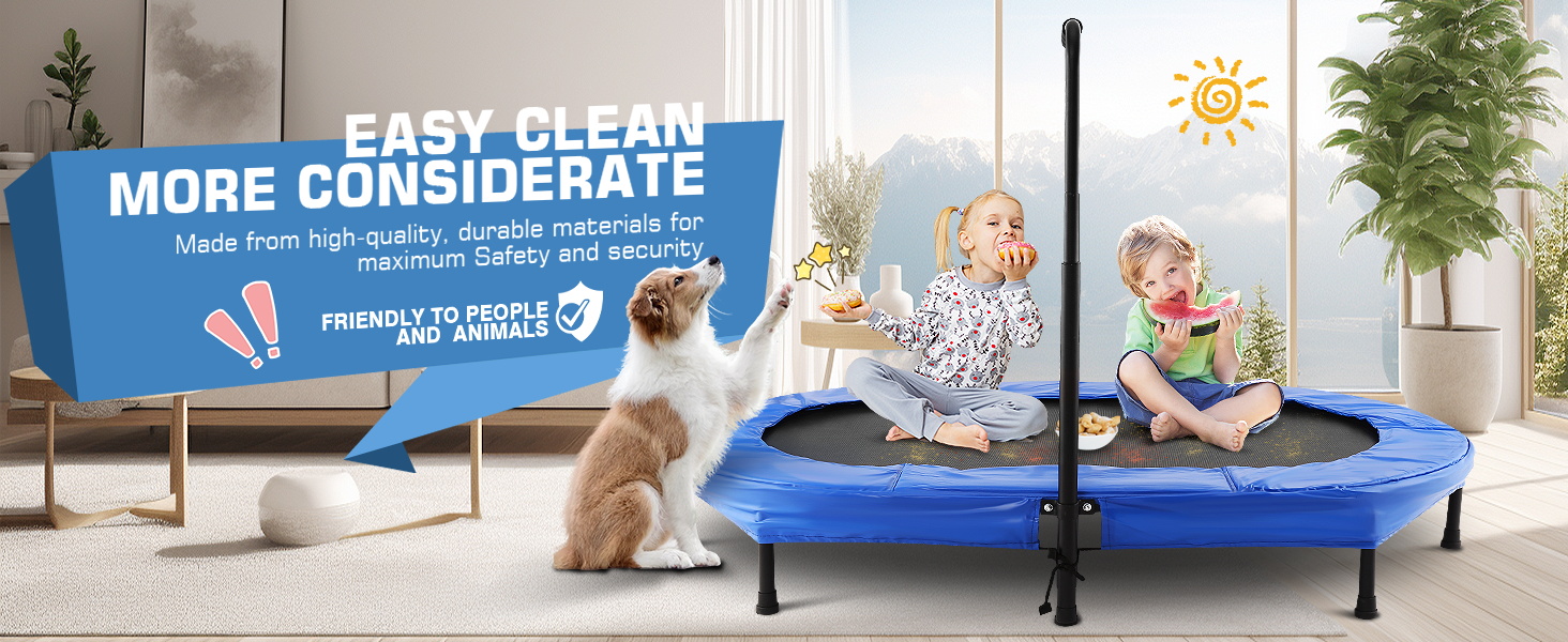 - u2705Suitable for All Ages: 5-Level Adjustable Handlebar for Customization: Tailor the foldable trampoline to accommodate different heights effortlessly with its adjustable handlebar. This remarkable feature makes it suitable for children of all ages, ensuring a customized and enjoyable bouncing experience.