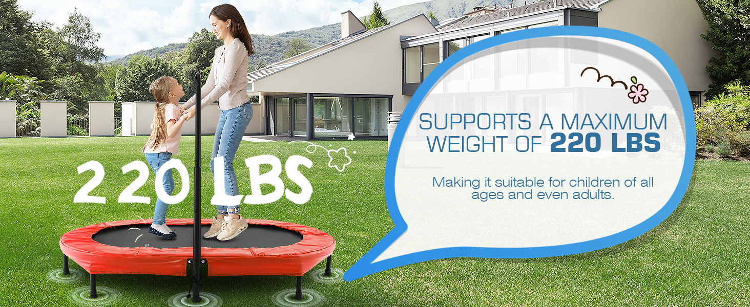- u2705High Weight Capacity: With a weight capacity of over 220 lbs, this trampoline for kids and adults can accommodate multiple children or even adults at the same time. It is sturdy and durable, providing a safe and enjoyable jumping experience for everyone.