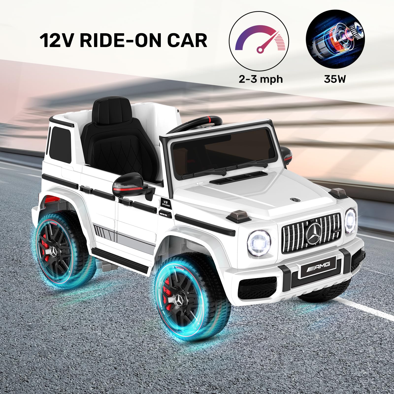 - [Licensed Mercedes Benz G63] Featuring the iconic grille for which Mercedes Benz is known, this g wagon electric car for kids is perfect for little ones who want to cruise indoors or outdoors in style. Driving in a luxurious and powerful car is now a joy you can pass on to your child with a miniature version of your favorite ride.