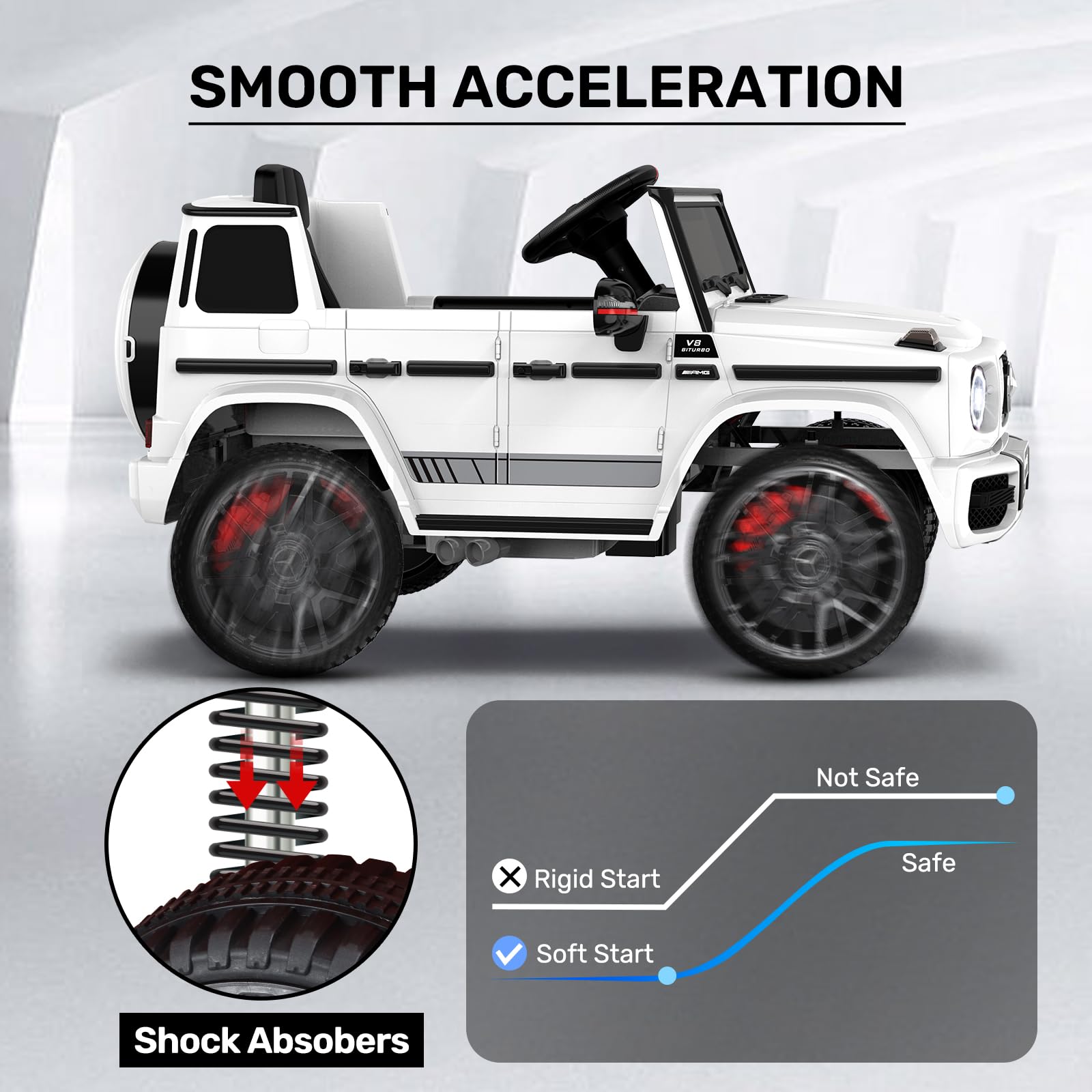 - [Safety is Top Priority] Except for the remote control, this car also comes along with many other safety features. Only when the power switch is on can the car be started, which prevents accidental startups. The safety belt and soft start design prevent kids from being startled by a sudden acceleration. The spring suspensions ensure super smooth rides.