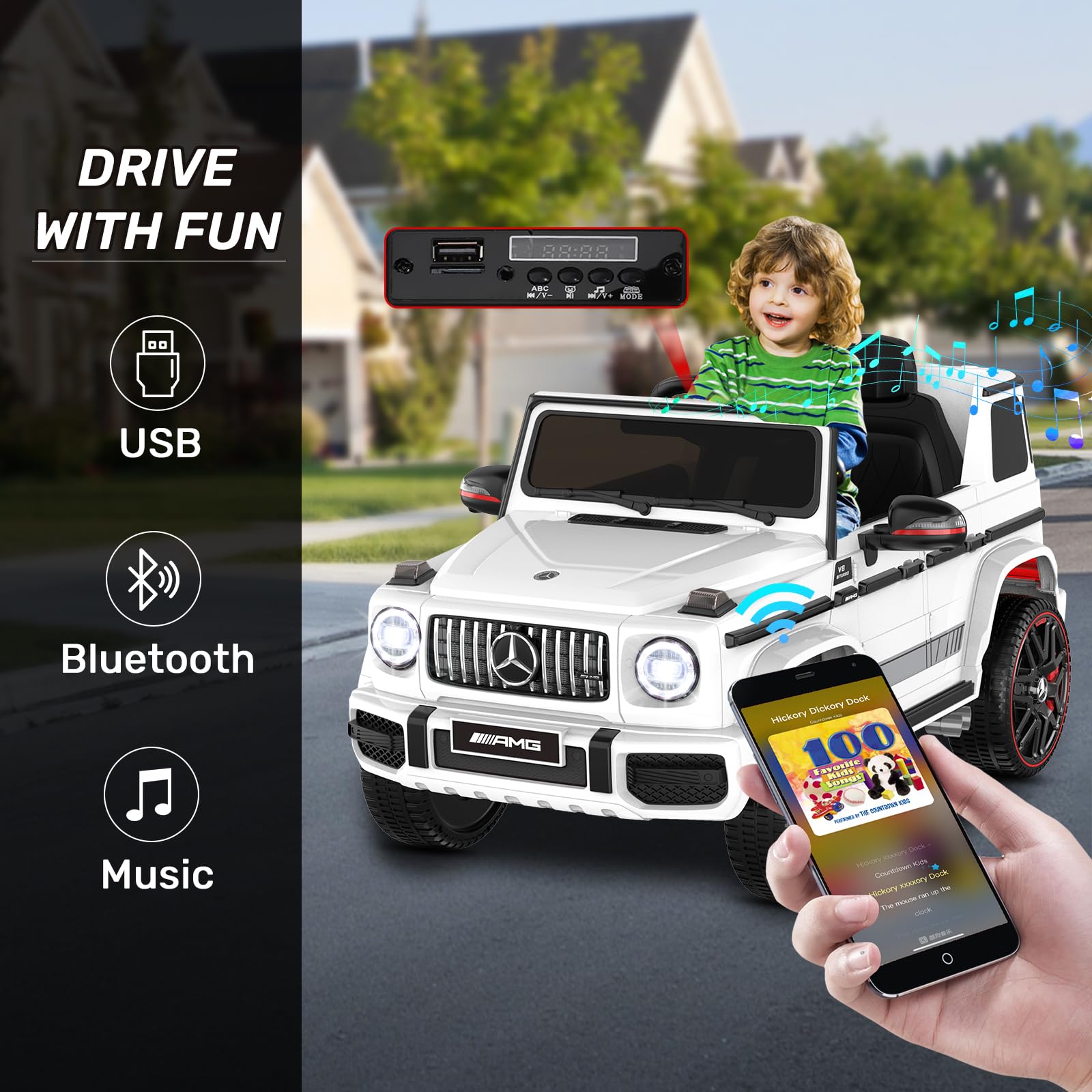 - [Connecting Kids World] For precocious youngsters who could hardly wait to drive by themselves, this ride-on toy can be the very opportunity for its' every single detail: headlights, horn and engine sounds, realistic pedal acceleration, smooth steering. In addition to the built-in songs, this ride-on car supports USB or phone connection to play songs kids love. Ideal gift for Christmas.