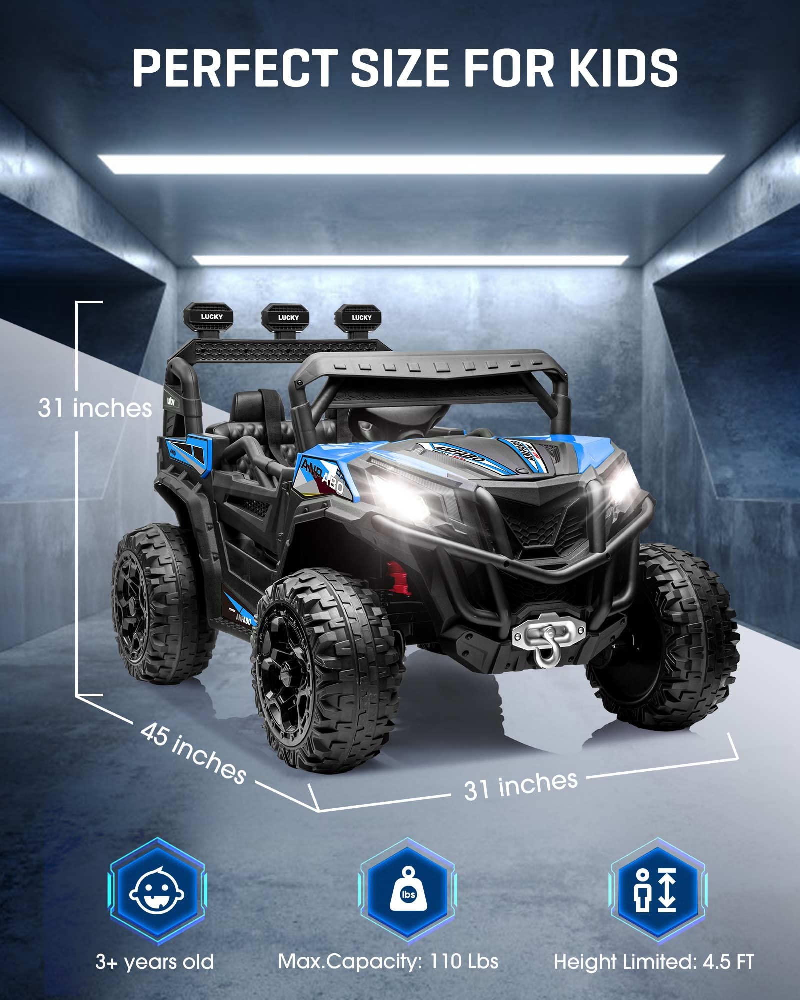 - GOOD CHILDHOOD PLAYMATE: 19-inch capacious seat, 14-inch large wheelbase and high chassis enable the car to bear 110 lbs weight, accommodate one 3-6 years old children (under 4.5ft heigt) or 2 small toddlers (under 3.4ft heigt) ; with an adjustable 5-point seat belt, this electric vehicle is suitable for children over 3 years old and up, a good playmate for your little ones