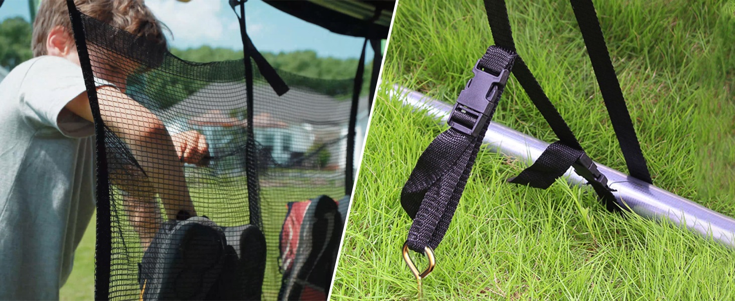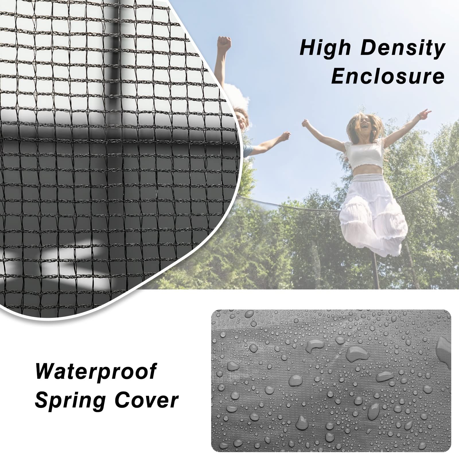 - FlexiNet & Enclosure Rods: Specifically made with flexibility and no climbing in mind, cushions wayward jumpers and prevents falls to the ground. Ultra fine weave ensures no injuries. Unique flexible net rods remove the need for hard metal poles that can cause injury. All design guide the jumper back to safety. The fine weave is designed to be resistant to tearing and doesn't fray or run.