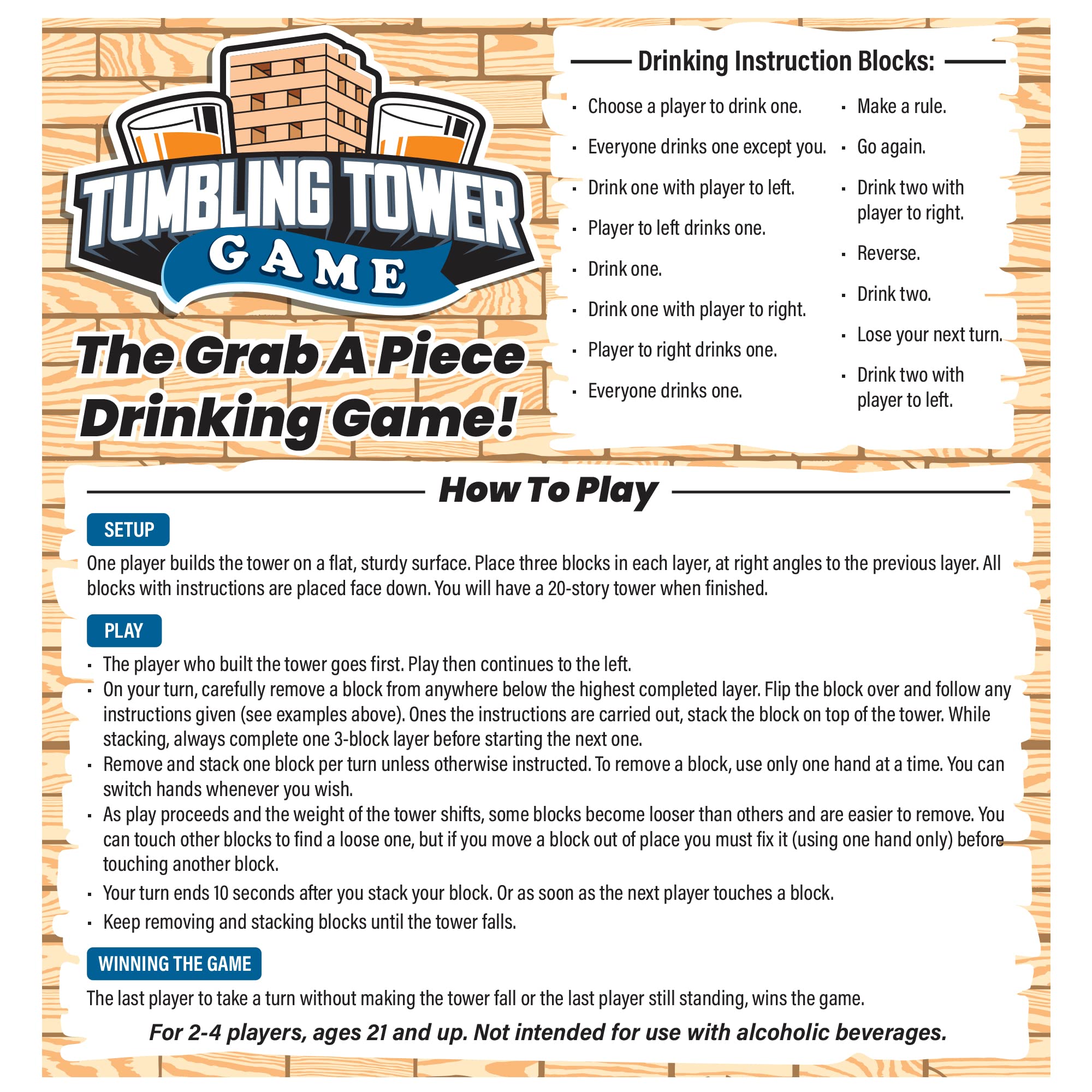 - HOW TO PLAY: Arrange the blocks and get out the liquor. Players take turns removing a block anywhere in the tower, following the written instructions, and placing the block back on the top. The last player to take a turn without collapsing the tower emerges the champ.