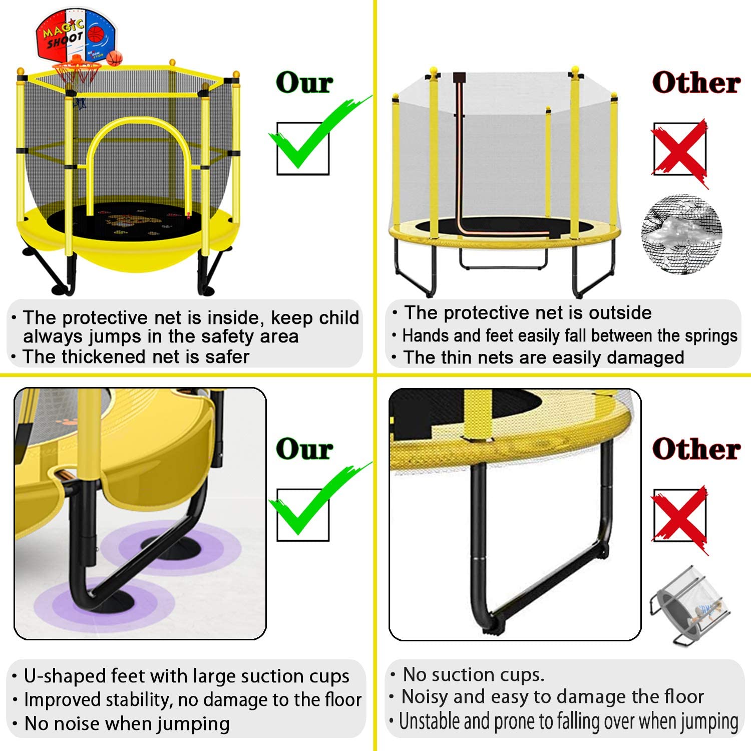 - SAFETY - The trampoline with high-density elastic enclosure net is comfortable and durable enough to keep kids away from danger. Meanwhile, the net is completely visible so that you can observe your kids outside surrounding mesh net. Double the dose of fun with jumping and shooting actions with the built-in entertainment basketball hoop.