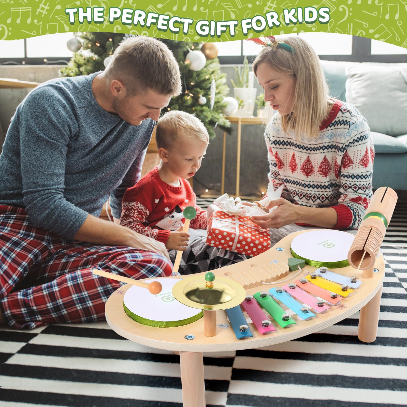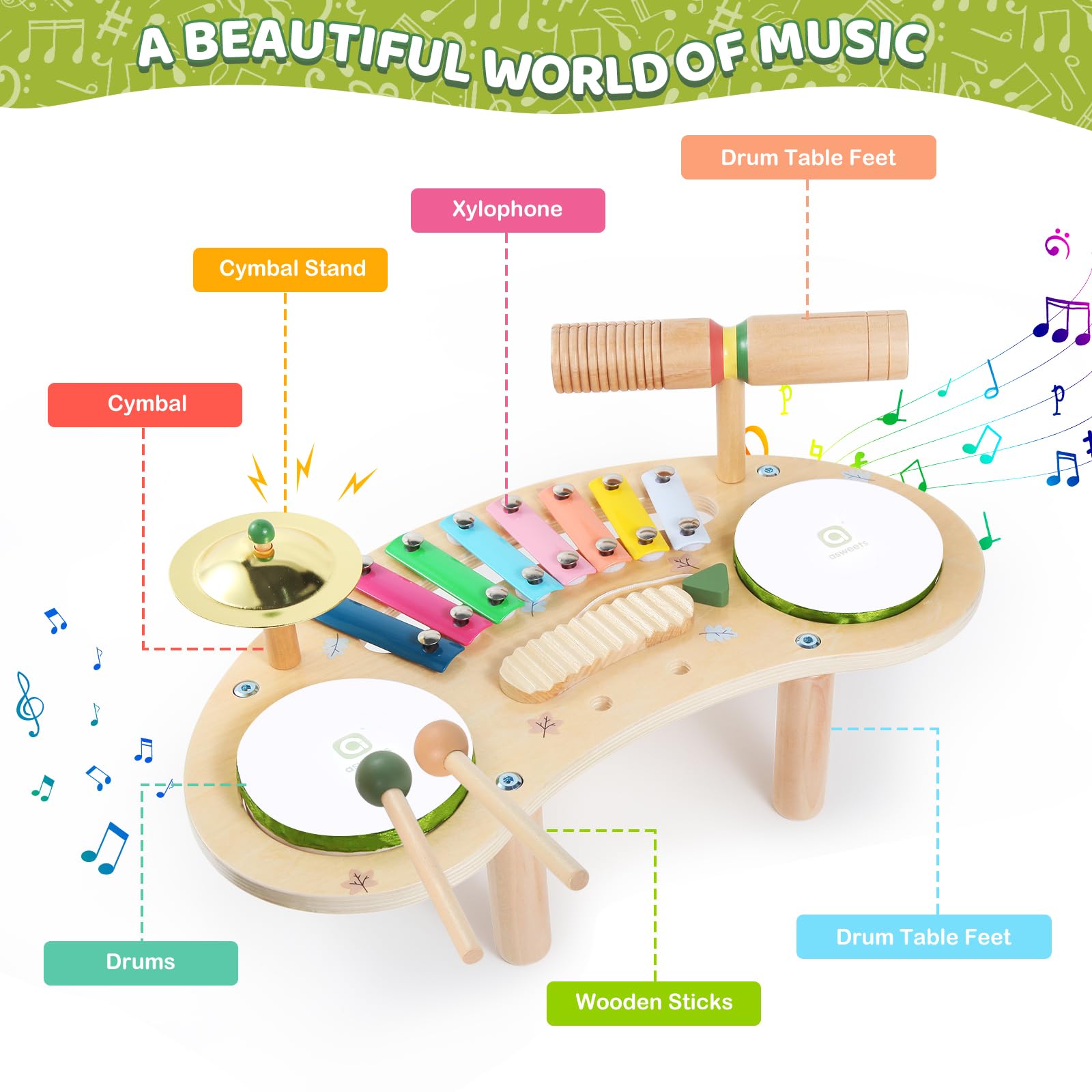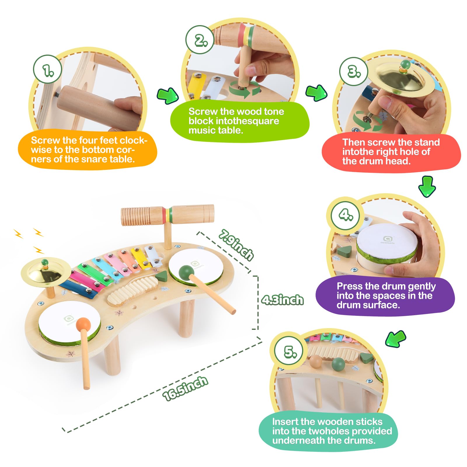- ud83eudd41 7 IN 1 KIDS DRUM: Toddler drum set not only enhances your child's interest in music and strengthens your baby's eye-hand coordination, but also develops fine motor skills and sense of hearing, which consists of a rounded music table, a xylophone, 2 wooden sticks, 2 drums, a Cymbal, a Cymbal stand, 4 Drum legs, and a Scratch MUSIC consists of.