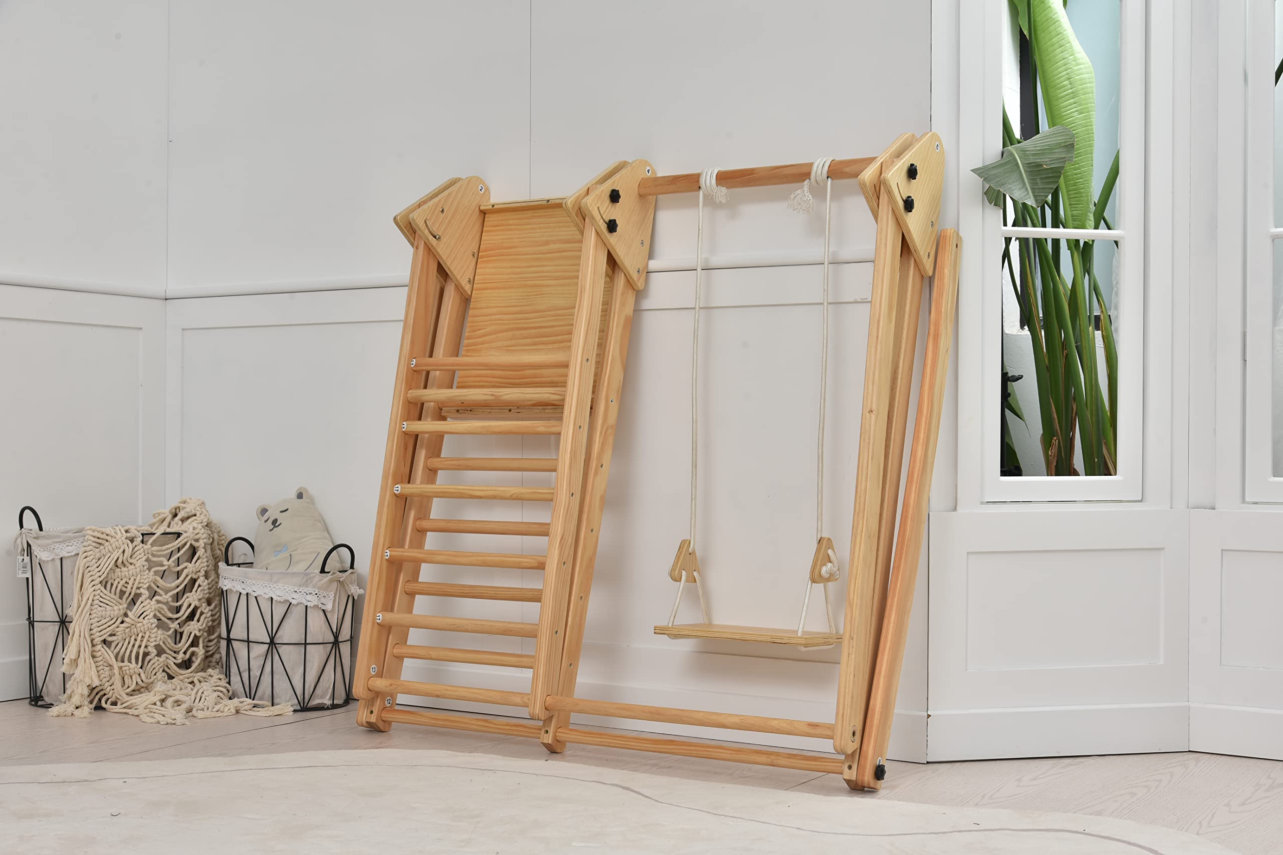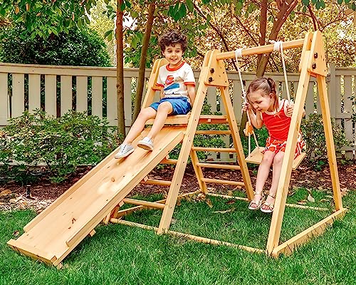 - Interactive Features: This indoor wooden play gym features a detachable slide, rock wall, baby swing, and regular toddler swing that comes with a baby belt swing and fastener for an easy swapping and installing.