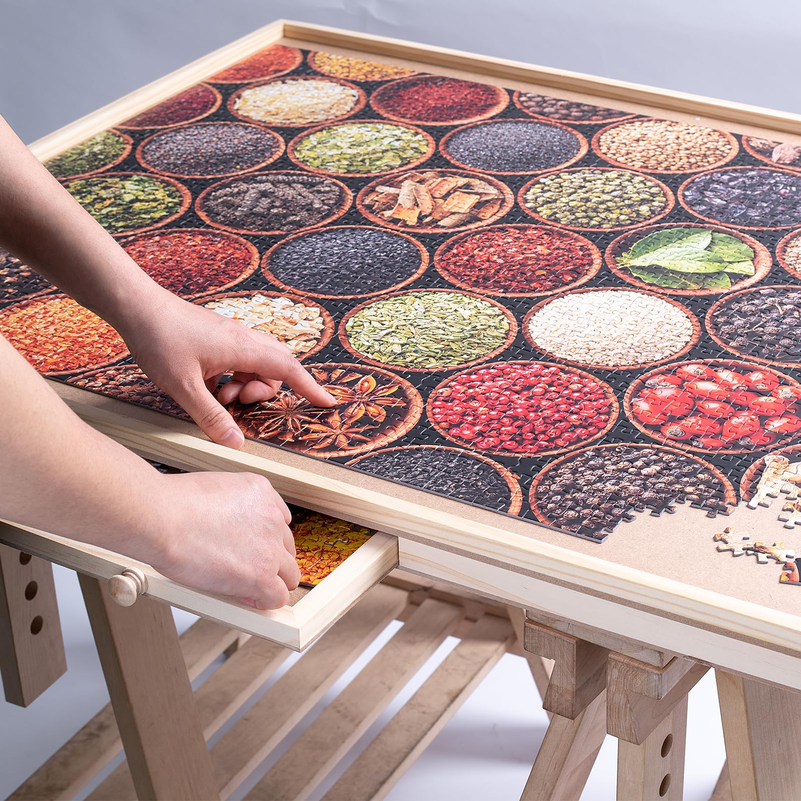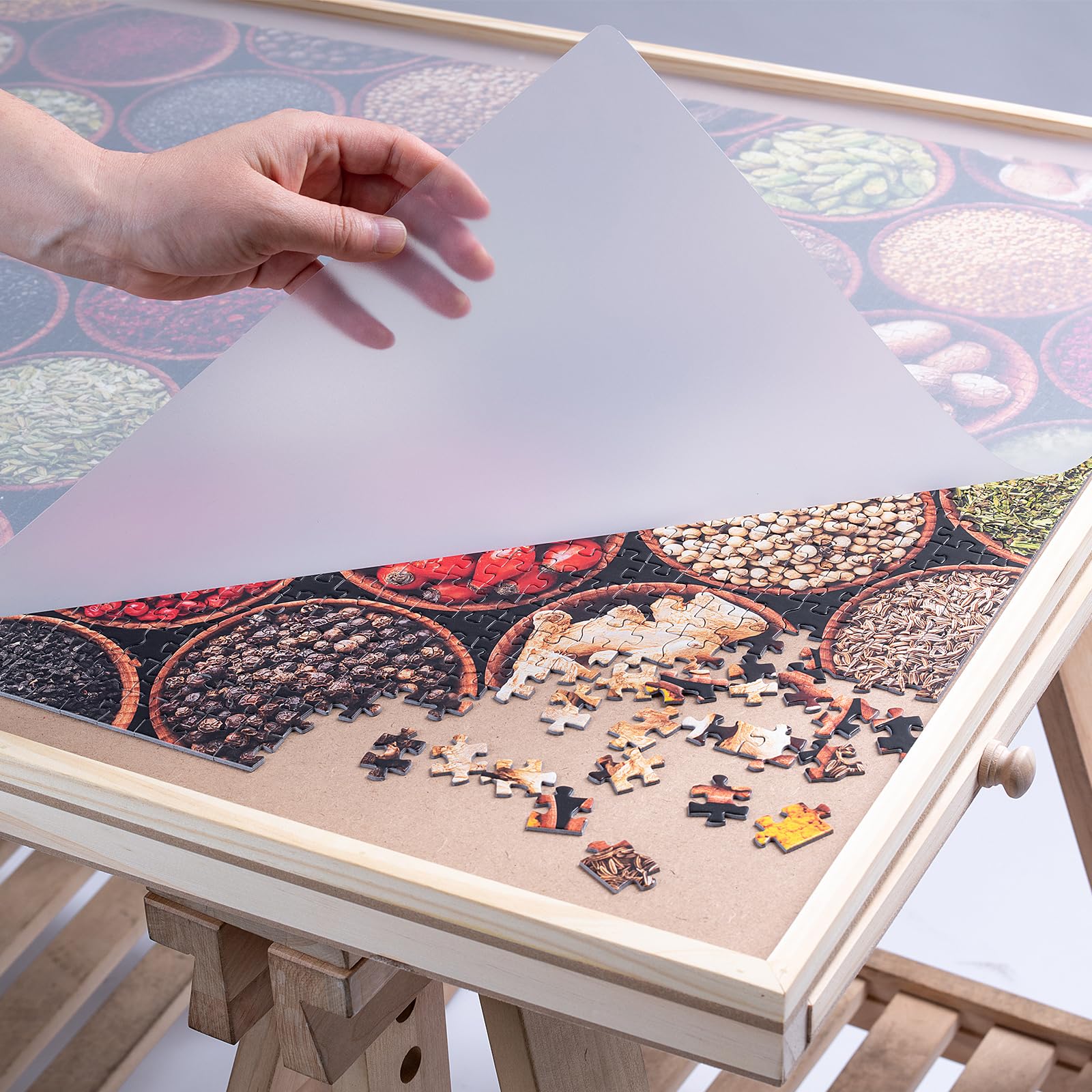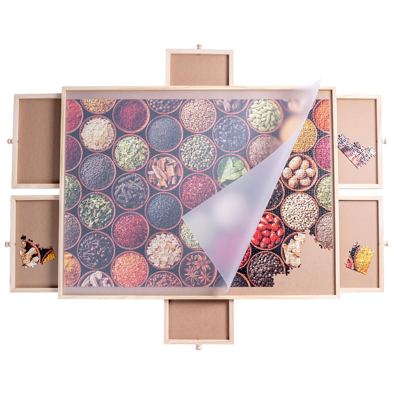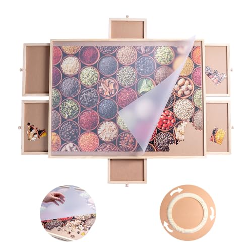- u3010 6 Drawers and cover u3011 The puzzle board has 6 drawers, which allows you to easily sort and store additional puzzle pieces, safely preventing the puzzle from being lost. Also with a translucent plastic cover, you can very well protect your masterpiece from dust, water and your curious cat until the next time you want to continue.