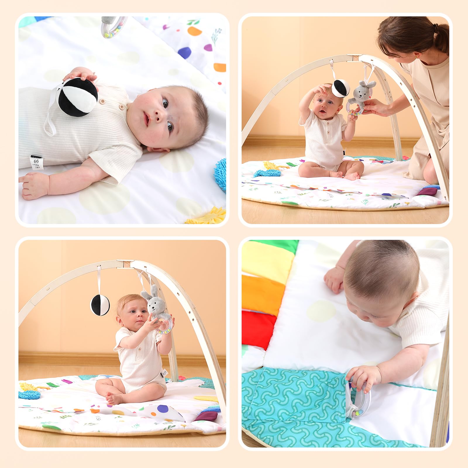 - Professional and detailed guides: We understand the importance of parental responsibility and have worked with child development experts around the world to design this baby gym and write detailed guides. There are various stages of baby growth information and dozens of game methods in the use of guidance, so that you can interact with your baby more purposefully and let your baby grow healthily.