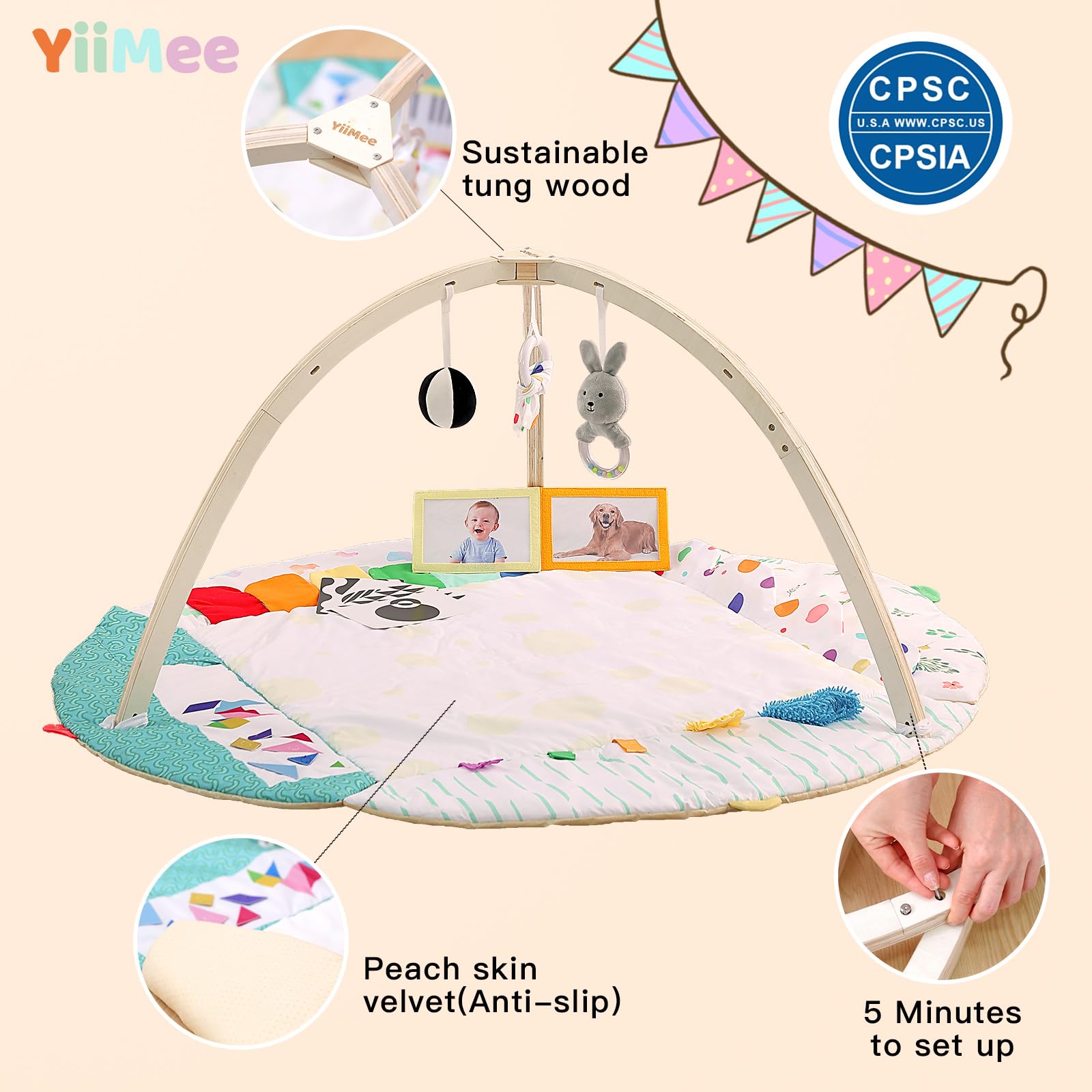 - Full-functional Baby Play Gym: A little angel comes to your side, I believe you must be very excited, but as a new parent, I believe you are also worried about how to let the baby grow healthily. The YiiMee Play Gym is designed for this purpose: Montessori inspired activities for babies aged 0-12 months to get familiar with their body and understand the world faster in terms of motor skills, vision, hearing and cognition.
