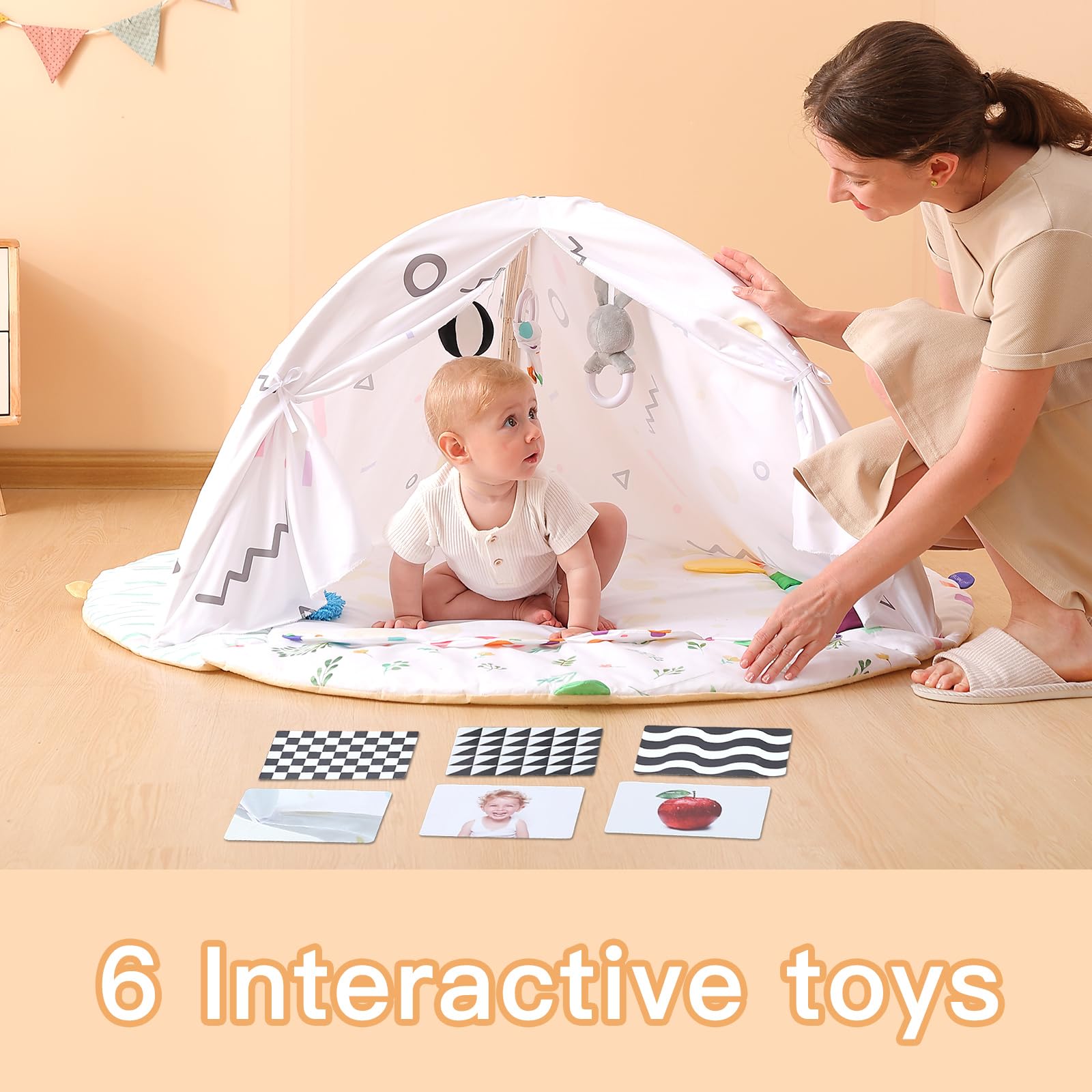 - 3-in-1 Play Gym: The playmat is made of soft, comfortable fabric. The size of the play mat is 50 * 50 inches, which is the largest of its kind and is perfect for tummy time. When the baby learns to crawl, you could hang the tent cloth on the wooden frame, it becomes the baby's play house, you can play peek-a-boo with your baby happily!