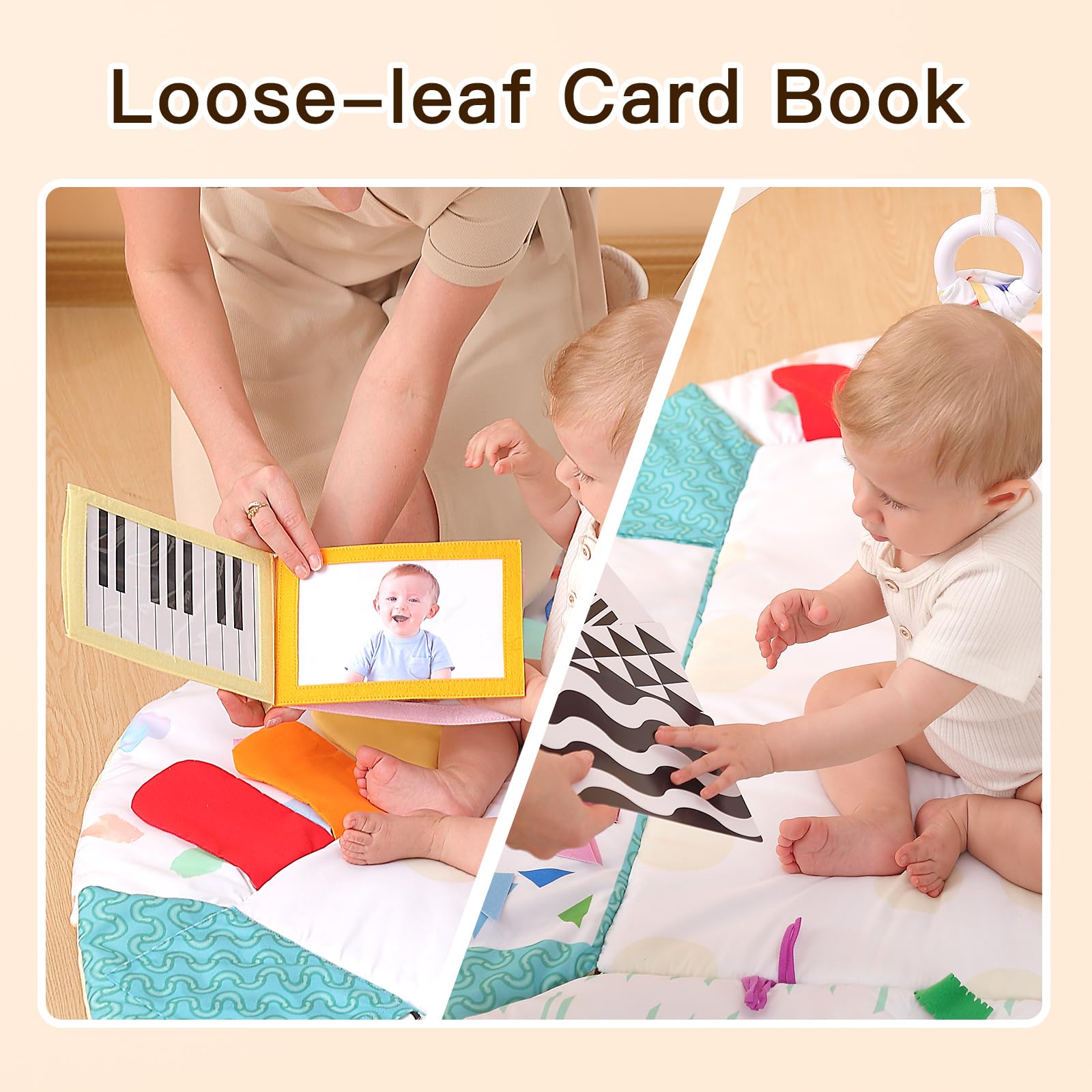 - Fun interactive toys: We have a loose-leaf card book that can be changed freely to make it easier to interact with your baby. There are black and white cards and cotton ball to inspire baby vision, soft mirror cards to know themself, and cute batting ring and teething ring to keep your baby interested in toys at any time.