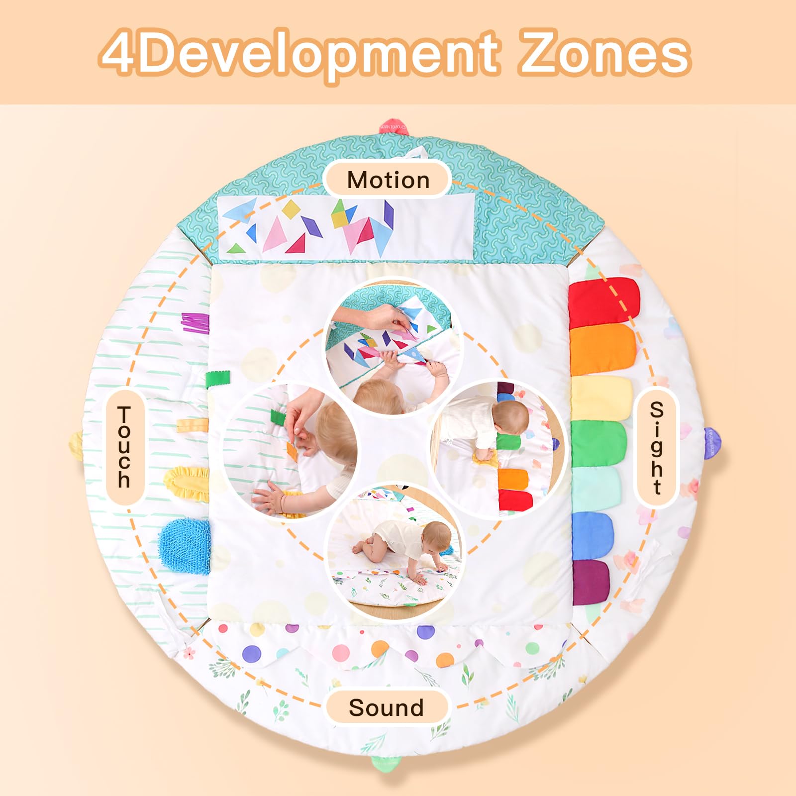 - 4 Functional Development Areas: There are 4 Montessori development areas on the play mat, so that your baby can stimulate visual development when playing, try to touch objects to make sounds, touch cloth with different tactile sensations, and fine control their movements.
