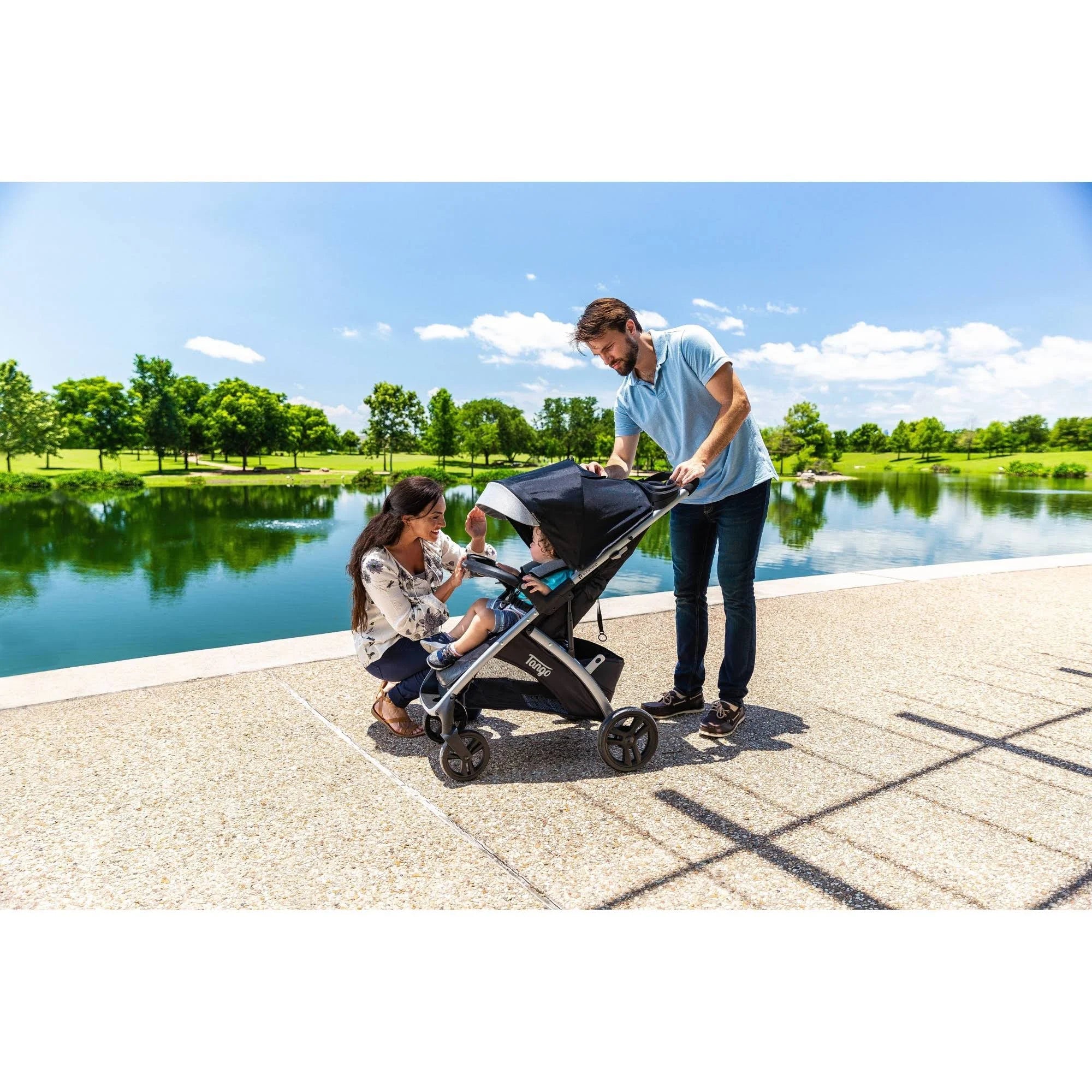 Indulge yourself with the perfect blend of quality, comfort and style when you and your child experience the Baby Trend Tango Travel System together. The lightweight, nimble stroller holds an abundance of features that you both will enjoy. Parent Premiums include convenient compact one-hand quick fold, a large storage basket with front and rear access, a contemporary parent console with cell phone positioner and two extra-deep flex-grip cup holders that will keep your large water bottles secure. Your child will appreciate the exclusive Comfort Cabin, complete with an extra-long canopy and visor with built-in UPF 50+ protection, deluxe fabrics with premium padding and dual frame suspension to ensure a smooth ride. When folded, the Tango Stroller is 30% more compact*. Turn the stroller into a travel system by combining the Tango stroller with the included Ally Infant Car Seat. The Ally features higher, deeper side wings with EPS foam for optimal side impact protection, a 5-point safety harness and a 4-position height adjustable base. It accepts infants from 4-35 lbs.