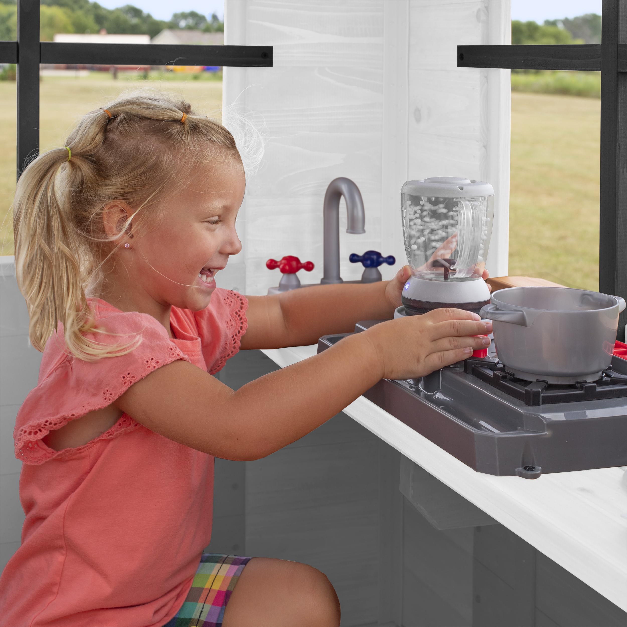 - Imaginative Play: Play kitchen, powered blender, working bell and working hinged door all included.