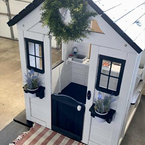 - COZY COTTAGE: Showcasing a country half front door, country style details in the design of the playhouse. The Sweetwater includes custom style flower pots on each side of the front door, kitchen with pots, pans, sink, phone, and a working doorbell.