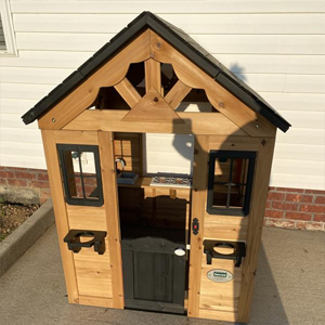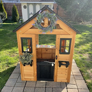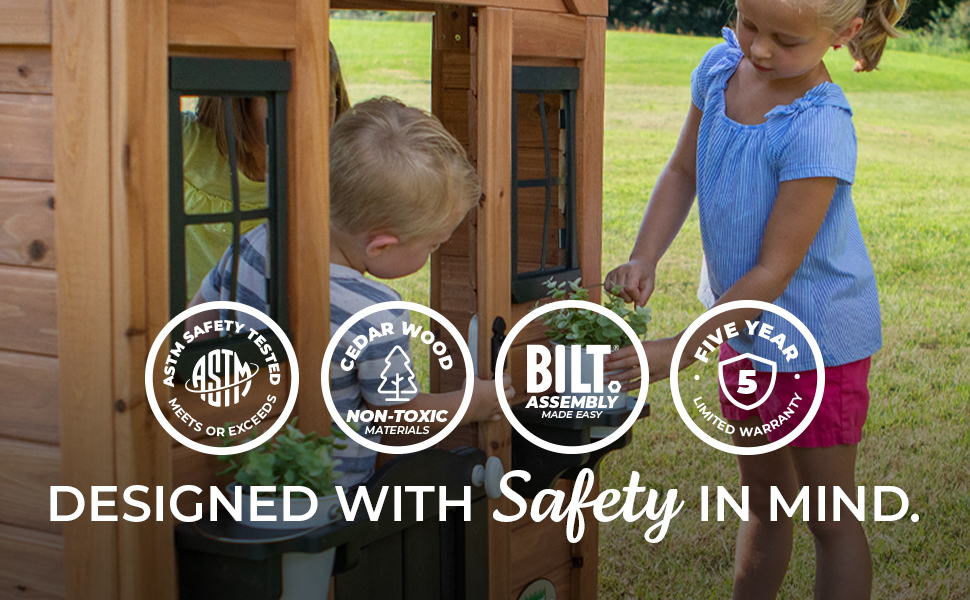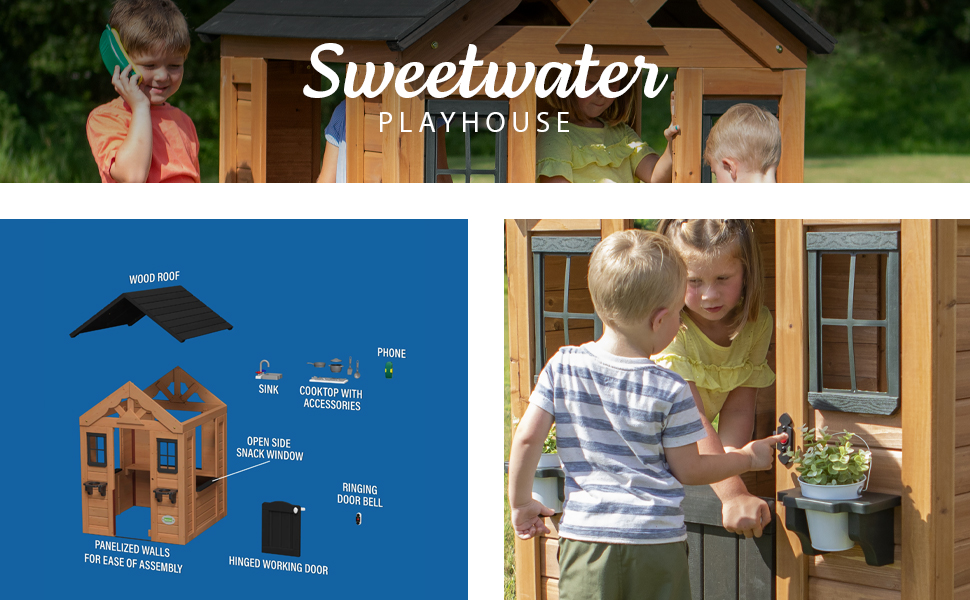 - SAFETY FEATURES: The Sweetwater playhouse provides hours of fun for your little one. The Sweetwater playhouse is made with quality, safe materials. The cedar is pre-cut and built safely, windows are made without any glass, indoor tools are plastic.