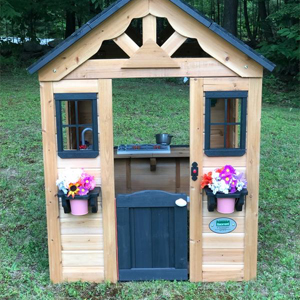- COZY COTTAGE: Showcasing a country half front door, country style details in the design of the playhouse. The Sweetwater includes custom style flower pots on each side of the front door, kitchen with pots, pans, sink, phone, and a working doorbell.