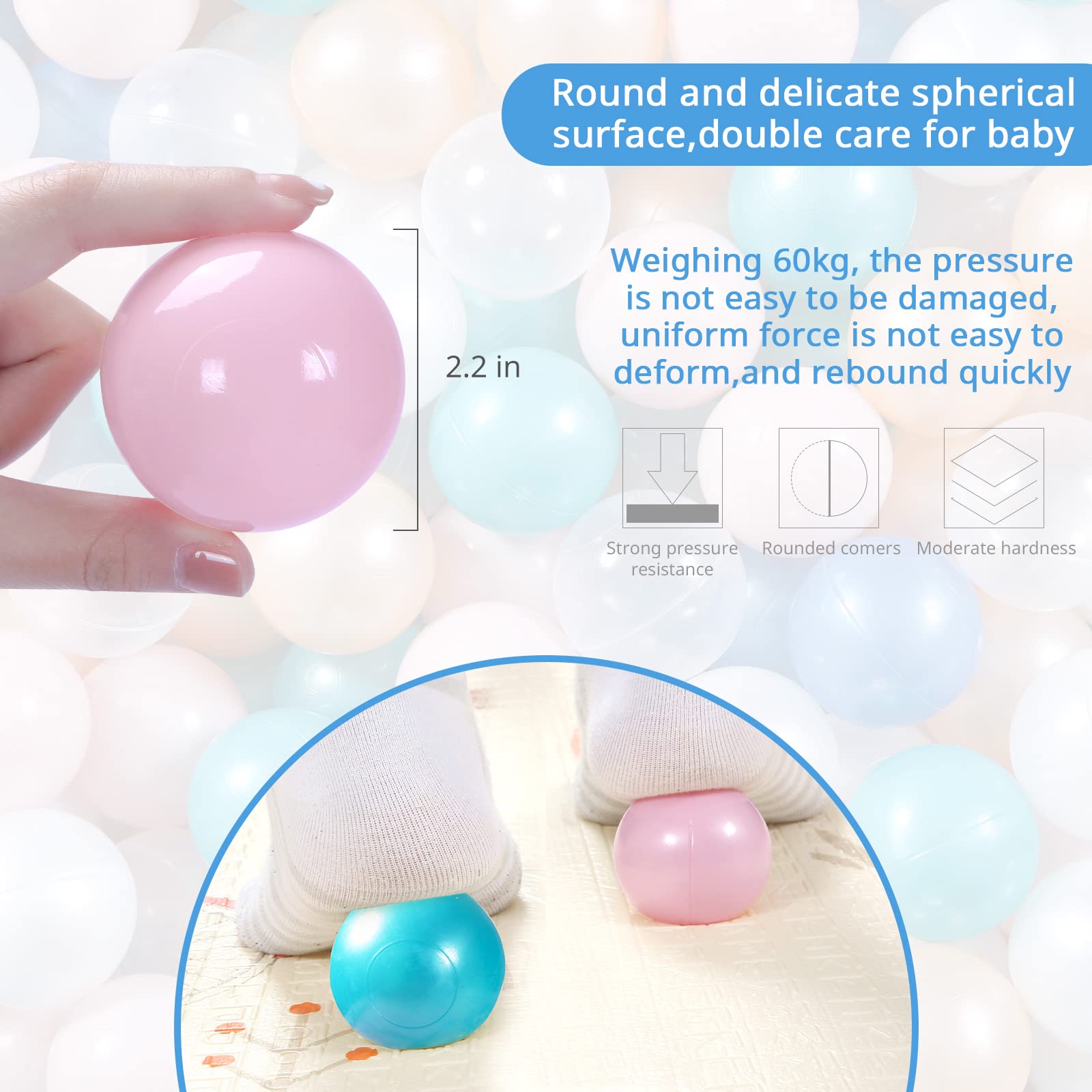 - u2765u3010DURABLE AND CRUSH PROOFu3011Each pit ball is 2.2 inches in diameter and is the perfect size for children, each Plastic Ball will withstand over 130 pounds of weight. It's soft enough for children and strong enough for adults. Our balls smooth, no sharp, parents no longer to worry about the baby in the process of playing, because it will not be scratched babyu2019s skin.