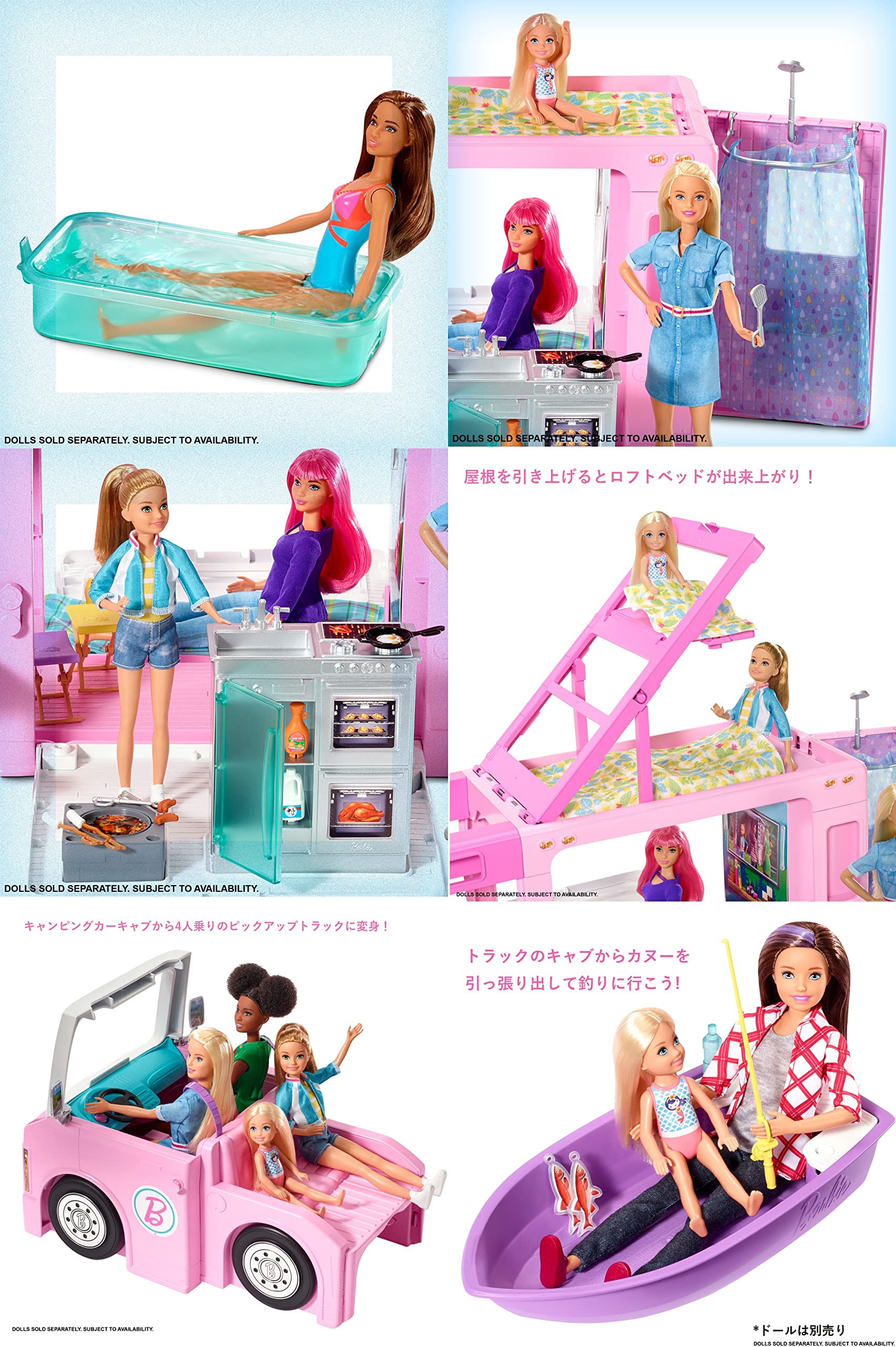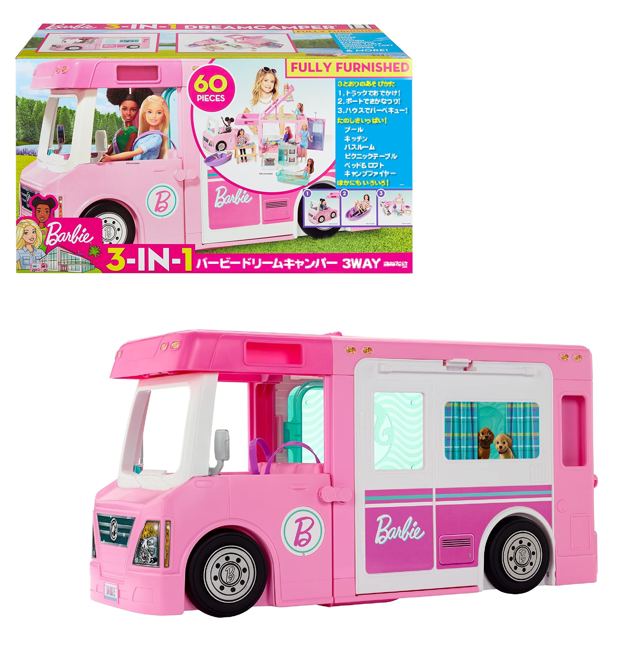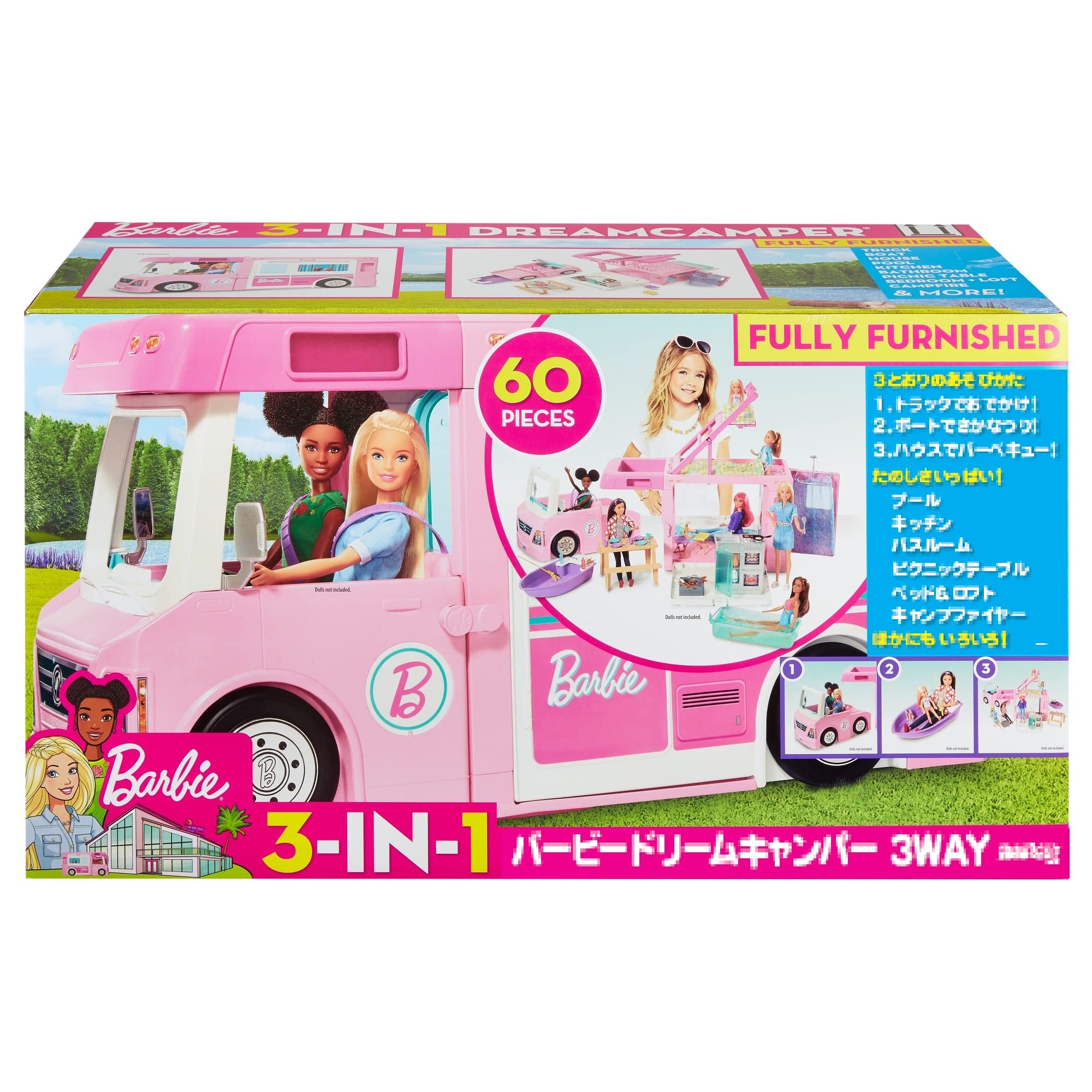- With multiple transformations, 3 vehicles, 5 living spaces, 360-degree play and 60 accessories, the Barbie 3-in-1 DreamCamper encourages young minds to explore outdoor adventures and bring their travel dreams to life!
