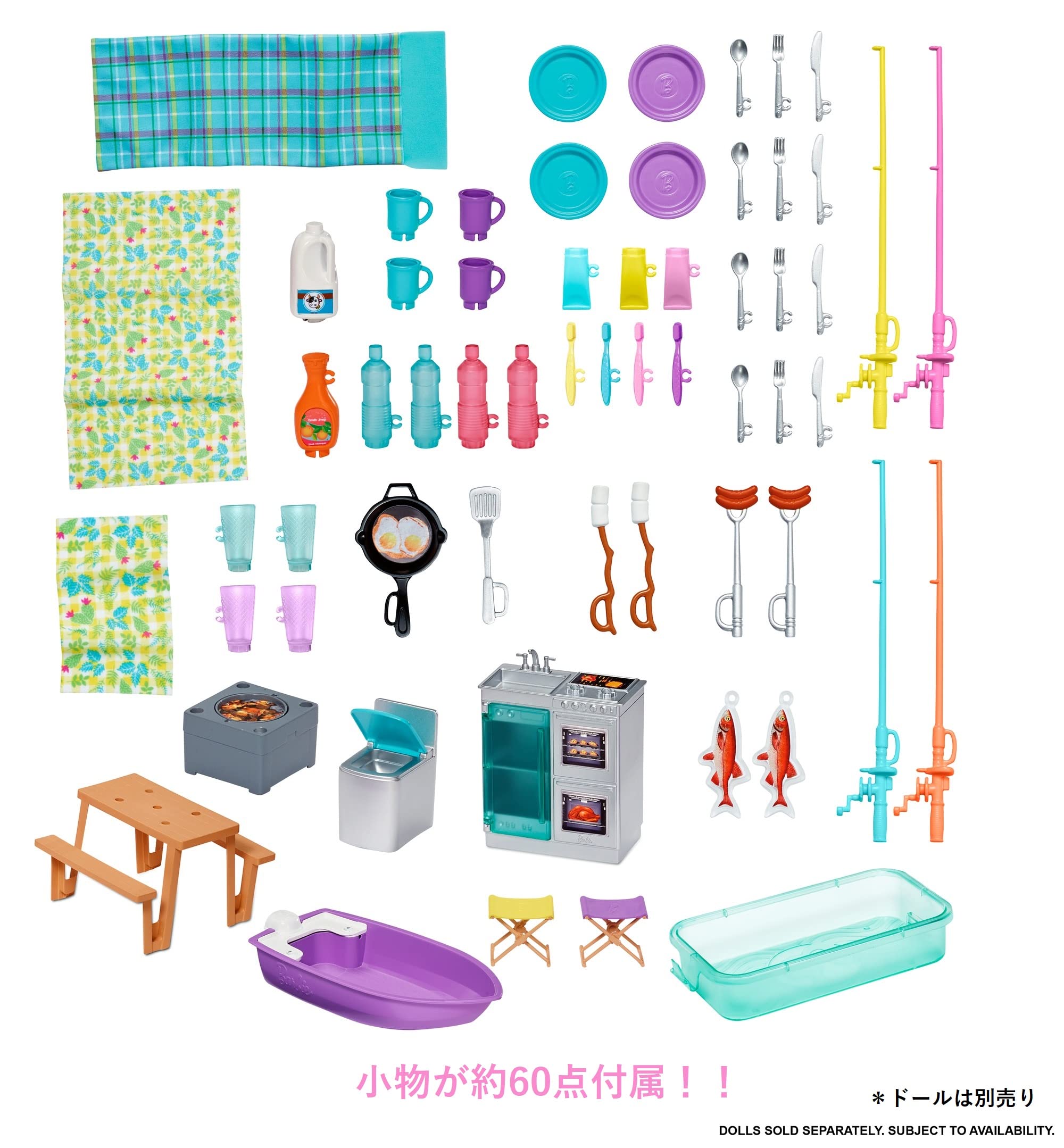 - With 60 play pieces, it's never the same adventure twice. Accessories include fishing gear, a picnic table with seating for 4, bathroom necessities, a sleeping bag, blankets and everything kids need to play out camping stories -like s'mores!