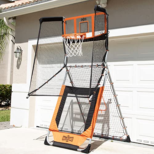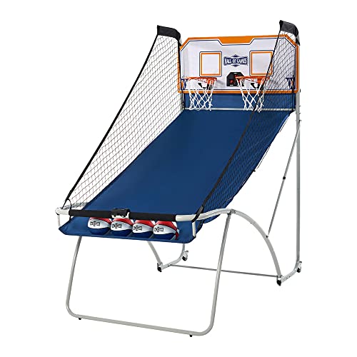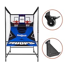 - ACTIVE PLAY & EASY STORAGE: This arcade basketball game has a heavy-duty 600D Oxford Cloth ball return, a pair of 15u201d steel rims, and for easy transportation and storage the back legs of this game have lockable casters with 3u201d oversized wheels.