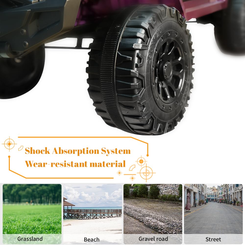 - ud83cudf81SAFETY DESIGN-- Four large resistant wheels which have the features of shock absorption and explosion protection will allow your kids to ride on different kinds of ground such as grass, brick road, wood floor, asphalt ground, plastic runway and more.